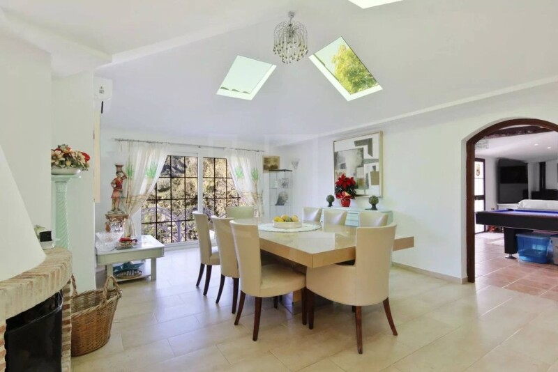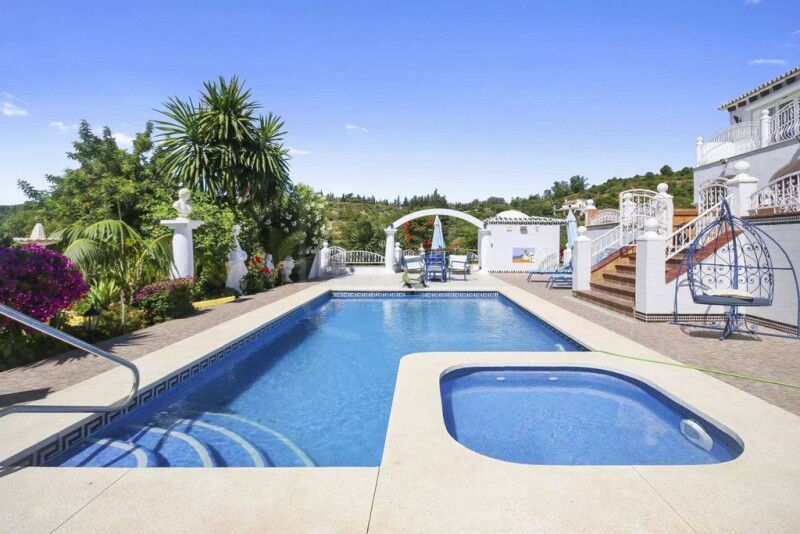 Beautifully presented Mediterranean style villa located in a tranquil position just 2 kilometres from the vibrant town centre of Estepona. Surrounded by nature yet only a 4 minute drive to the pristine beaches of the Costa del Sol. The 334 sq.m villa comprises an entrance hall, a fully fitted modern kitchen, dining area, games room with a pool table and home cinema area, a spacious living room with vaulted ceilings, expansive windows and balcony that creates an airy and inviting ambience, 4 bedrooms and 4 bathrooms. One of the bedrooms boast sea views. Additionally there is a small and charming guest house. Other features include solar panels, double glazing, storage room, utility room, fireplace and a spacious carport with ample parking for multiple vehicles. The outdoor spaces is designed for the ultimate Costa del Sol lifestyle. The beautifully landscaped garden includes a heated swimming pool surrounded by ample sunbathing space, various covered and open terraces, a dedicated children's play area and a jacuzzi and hammam steam bath. The meticulously garden and a row of mature trees ensure complete privacy and a serene atmosphere.