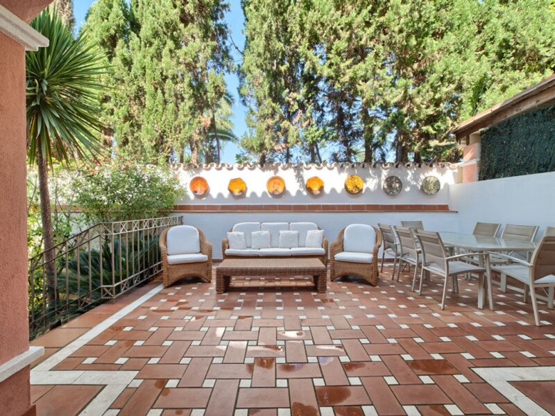 Semi detached spacious quality villa second line beachfront. South to west facing. Built 2005. Main floor: Living/dining area with fireplace, fully fitted kitchen with breakfast area, one guest bedroom with separate bathroom. Terraces, garden and private heated pool. Carport for one car. First floor: Master bedroom suite and two guest bedrooms sharing one bathroom. Topfloor: Roof terrace with BBQ area. Lower floor (basement): Second living area, guest bedroom, bathroom, laundry area. Beachfront, walking distance to San Pedro and Puerto Banus.