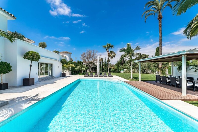 Villa Playa. Modern villa close to the beach in New Golde MIle, Estepona Nice, modern villa walking distance to the beach and some restaurants. The main house is divided into two floors and has several independent areas on the outside. On the ground floor there is a spacious living-dining room with independent and fully equipped kitchen. From this floor there is access to the outdoor area with barbecue area, relax area and private swimming pool. Two en-suite bedrooms and a guest toilet complete this floor of the main house. The first floor is occupied by the master suite with exit to a private terrace with sea views. In the outside area there is a guest house with two bedrooms, laundry room, bathroom, living room and kitchen. In another independent area there is a closed garage for two cars with a room/study which is currently used as a gymnasium, a small kitchen and a complete bathroom. Situated in El Paraiso and only a short drive to Puerto Banus and Marbella, surrounded by golf courses, supermarkets, luxury hotels and all the amenities you could need.