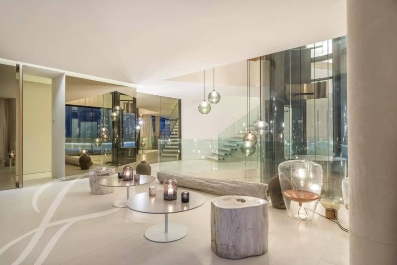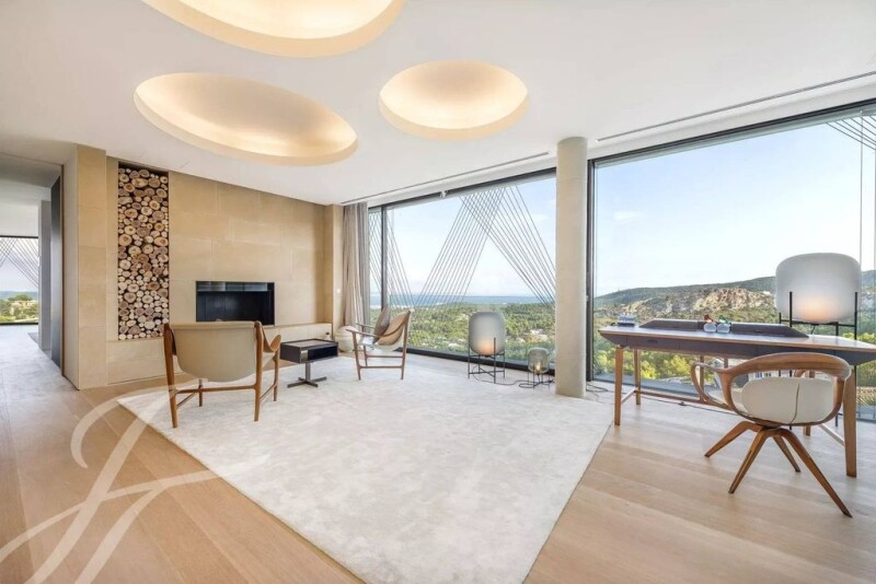 The façade is a dynamic representation of boat sails that float above the ground floor. South-facing, with complete privacy, the interior is full of light. The whole form of the building is stretched along the length of the site to create maximum frontage and exploit the wonderful views. The villa has four floors: the ground floor with living areas, the first floor with sleeping areas, the roof deck with an open-air cinema, and the basement with underground parking and service areas. The basement has a video art installation welcome area, a fresh green Zen garden, generous parking with places for six unique cars, a fitness room with treatment space, and staff areas with two additional parking spaces. The basement has two fully equipped staff bedrooms and a pantry. From the welcome atrium, you can take the platform lift directly to the living areas and the bedrooms. A transparent glass façade on the ground floor means the huge living room opens out and extends into the garden doubling the living space in summer. The infinity terrace is surrounded by the natural landscape and invites you to experience an unforgettable sunset. The desire to bring the Mediterranean landscape into the building improves the connection between the interior and the garden. Outdoor seating areas become a continuation of the living room. The ground floor is an incomparable open space that can be divided into representative and informal areas. The representative area has a spectacular living room with an attractive open fireplace, a superior dining room, a satellite kitchen, and a sensational wine cellar. The informal area is the focal point where guests might meet while dinner is being prepared. Working with designer Nilufar, the interior is comprised of specially selected accessories and furniture. A mixture of custom-made and unique pieces of furniture by Italian designers makes the interior distinctive and characterful. Nilufar is known today as one of Italy’s most active and original galleries in the field of historical design, antique furniture, oriental carpets, lighting, and works of art.