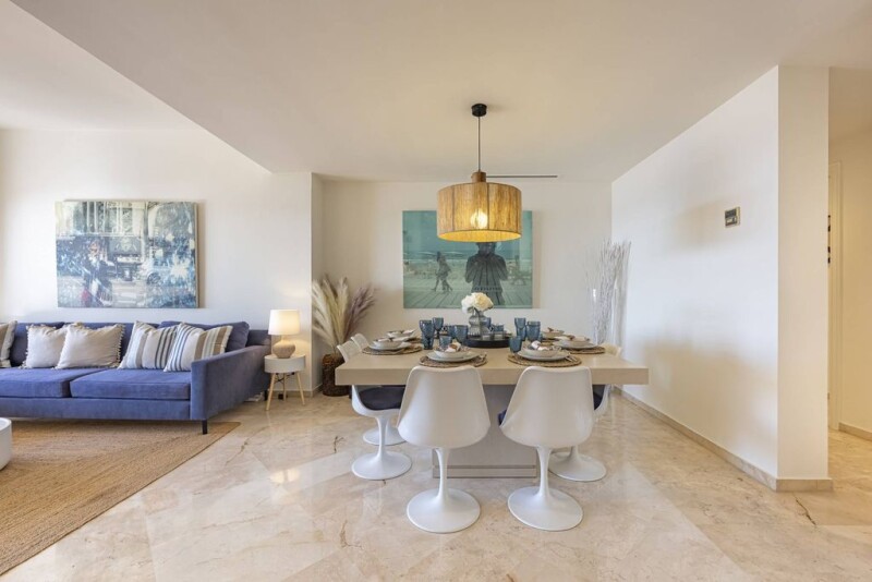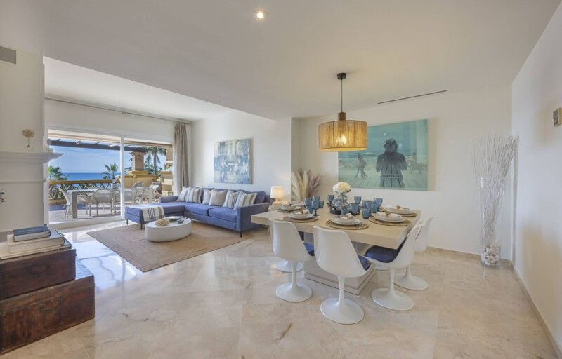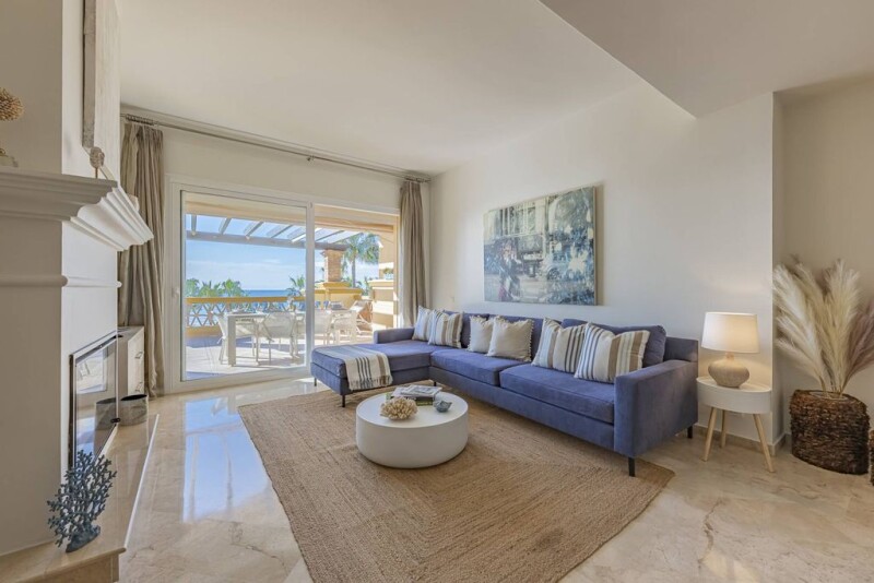 Exquisite frontline beach apartment in Río Real, Marbella Located in the prestigious Río Real Playa community, this stunning three-bedroom beachfront apartment offers breathtaking panoramic sea views and an unparalleled coastal lifestyle. Nestled alongside the renowned Río Real Golf Course, this prime location in Marbella East provides residents with privacy, exclusivity, and direct beach access. Just a short stroll from Trocadero Beach Club and within easy reach of luxury golf and resort amenities, this property is ideal for those seeking both tranquility and convenience. Bathed in natural light, the apartment features a spacious open-plan living and dining area with floor-to-ceiling windows that connect seamlessly to a 45 m² south-facing terrace, perfect for al fresco dining while overlooking the Mediterranean. Two of the three generously sized bedrooms enjoy direct sea views and en-suite bathrooms, while the third bedroom boasts a private terrace. The fully equipped kitchen offers modern appliances, ample storage, and a separate laundry room. Additional highlights include air conditioning, electric shutters, built-in wardrobes, and double glazing for year-round comfort. Set within lush tropical gardens, the Río Real Playa complex features two communal swimming pools, one of which is heated, enhancing the resort-style living experience. The property also includes a private underground parking space and two storage rooms, with courtesy guest parking available. Just 30 minutes from Málaga International Airport, this secure gated community offers an exceptional opportunity to experience luxurious beachfront living in Marbella East.
