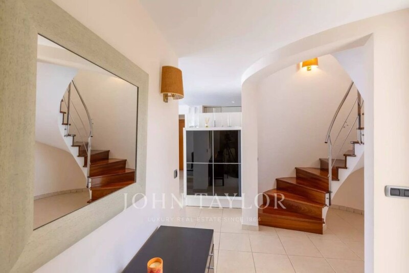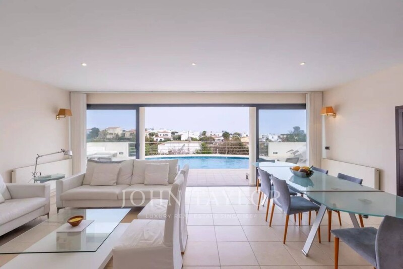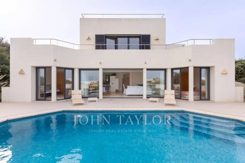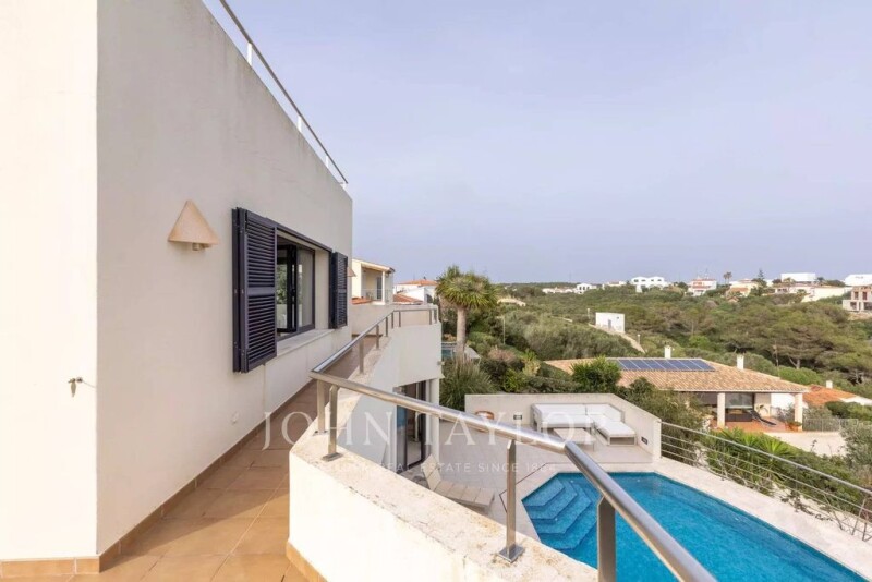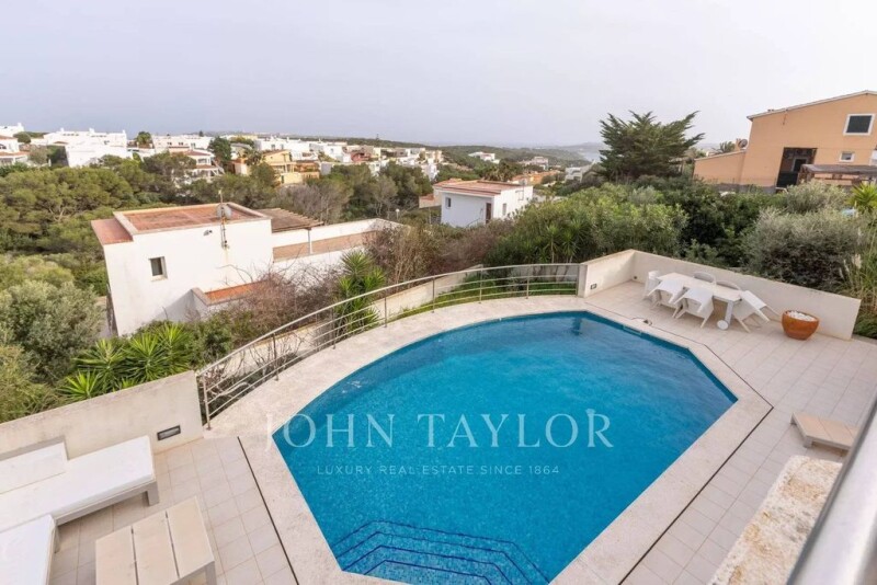 Located in the prestigious urbanization of Cala Llonga, one of the most exclusive areas of Menorca, this spectacular detached villa offers privacy, brightness and stunning sea views from all its terraces, highlighting the entrance to the estuary and, from the top floor, the city of Mahon. Its elegant design, with a predominance of white, enhances the feeling of spaciousness and clarity in all spaces. The house is distributed on two floors plus a solarium. On the main floor, a spacious and bright living room with large windows opens directly onto the terrace and pool, creating a fluid atmosphere between indoors and outdoors. On this same floor are two bedrooms, both with access to the pool area, two bathrooms, a fully equipped kitchen, a study and a large laundry room with access to the side garden, which includes pantry-type storage space and a boiler room. An elegant spiral staircase leads to the upper floor, where the spacious and exclusive master bedroom opens onto a large terrace with privileged views. Also on this floor there is a bathroom with bathtub and a multipurpose room that can be used as an office, playroom or any other need. Upstairs, the solarium offers an ideal space to relax while enjoying the unobstructed views. The garden, distributed on two levels, perfectly complements this magnificent property, which also has three independent storage rooms, ideal for tools or outdoor equipment. The location is unbeatable: Cala Llonga offers an exclusive and quiet environment, with easy access to Mahón and all its services, and is only a 40-minute walk from the emblematic fortress of La Mola.