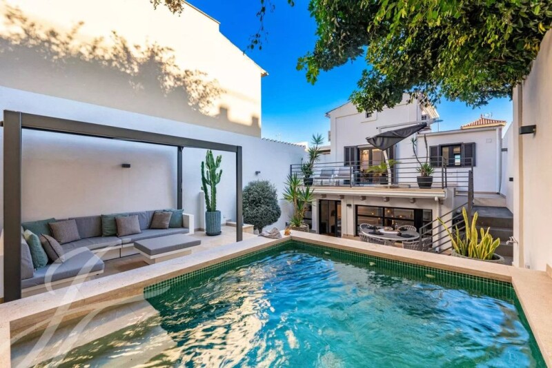 Discover this stunning two-story townhouse located on a serene street in the sought-after El Terreno neighborhood of Palma. This property combines modern comfort with timeless elegance, offering an exceptional living experience in one of the city's most desirable areas. With a total living area of 320 sqm, of which 170 sqm is interior living and 150 sqm exterior living assures the maximum indoor-outdoor living experience. From the welcoming entrance, access the private garage, a guest bedroom, and a stylish bathroom. The heart of the home lies in the open-plan living and dining area, where sophistication meets functionality. The high-quality kitchen boasts a hidden utility room, complete with a washing machine and extra storage space. The spacious living room, featuring a floating fireplace, seamlessly connects to the property’s centerpiece: a natural stone-clad terrace. With multiple levels and cozy retreats, this outdoor haven is perfect for hosting gatherings or relaxing with family. The terrace includes a private pool and a shaded seating area under an adjustable pergola, offering total privacy. A staircase leads to the upper floor, where you’ll find the master bedroom with direct access to a sunny terrace and a spacious attic. Adjacent is a luxurious bathroom equipped with a bathtub and a dedicated dressing room. Another bedroom on this level, currently used as an office, opens to a duplex terrace offering breathtaking views of the vibrant El Terreno district. This townhouse comes with numerous high-end features for ultimate comfort: Gas heating and air conditioning (hot/cold). Sonos sound system, adjustable pergola for versatile outdoor use, fully developed attic for extra storage. Private garage for a small car and an additional rented parking space next door. Don’t miss the chance to experience this exclusive townhouse. Contact us today to schedule a private viewing and explore the charm and luxury of this unique property. The neighborhood of Palma de Mallorca is located between the promenade and Bellver Park. Originally, between the end of the 19th century and the beginning of the 20th century, it was a summer resort for the bourgeoisie of Palma, which is why you can still find beautiful manor houses in this area. The slope of the land allows enjoying amazing views of the sea from many of its corners. It was the center of Palma's nightlife for many years and now it shines again and is in the spotlight for both residents and the international public, and it is not surprising - as there is the fabulous Paseo Marítimo with one of the better shopping areas with the Porto Pi Shopping Center (including the Casino de Mallorca) or Bellver Forest for leisure activities, the national and international schools (including the Swedish school), in addition to the Swedish church right at the doorstep. New hotels, bars, restaurants, and shops open their doors bringing back the lifestyle quality, and modernity that this booming neighborhood has always deserved.