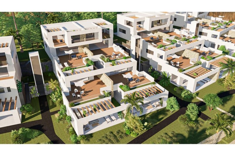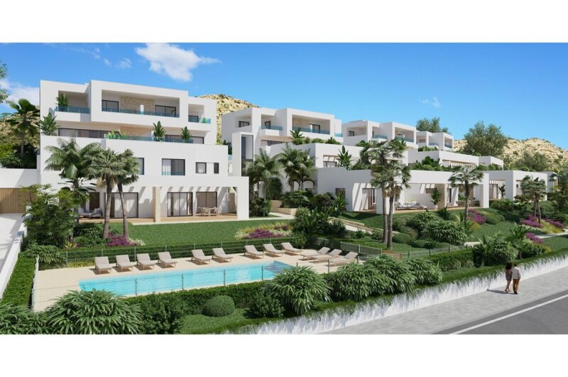 New modern luxury apartments located in the exclusive Font del Llop golf resort, in the village of Monforte del Cid. The project consists of apartments with 2 or 3 bedrooms and 2 bathrooms, a communal swimming pool, large green communal areas. The complex consists of ground floor apartments with large terrace and with direct access to the communal garden and pool or penthouses with private solarium with pergola. All apartments are South facing, with views of the golf course. The apartments are equipped with a spacious lounge/dining room, an open plan kitchen, fitted wardrobes, air conditioning (hot/cold) throughout the property, and with spacious terraces with stunning panoramic views. There is also a parking space included in the price! The properties are set within the Font de Llop golf resort and are walkable to the club house with all the usual amenities that a club house offers, including a restaurant and pro-shop. Font del Llop Golf Course is an 18hole championship golf course open to members and guests alike, offering stunning views of the Spanish town of Aspe. It is only a 15-minute drive to reach the beach and only a 20-minute drive to reach the international airport of Alicante. Interested? Do not hesitate and contact our office. We are happy to help you further.