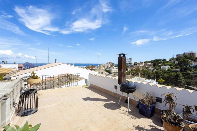 This charming house is located in El Terreno, next to Bellver Park, and with a breathtaking view of the sea and Genova. The entrance is private and exclusive, giving you a feeling of privacy and independence. The apartment is spread over two floors and has two spacious roof terraces, which offer fantastic panoramic views, as well as a shaded patio of around 40 square meters, ideal for relaxing hours outdoors. The property has been renovated with attention to detail and respect for its history. Historic tiles, for example, have been carefully preserved as far as possible and complemented by high-quality oak flooring, which lends a warm and inviting character. In the sanitary area, traditional elements have been combined with modern Villeroy & Boch and Duravit fittings, creating a harmonious mix of old and new. The kitchen in neutral and timeless white is a real highlight of this property. It is not only aesthetically pleasing but also functional. The high-quality stone worktop not only provides ample work space but also gives the kitchen a modern and elegant look. In addition, the kitchen is equipped with all the necessary appliances to give you a smooth cooking experience. A large fridge, a modern hob with oven, and a dishwasher are just some of the amenities at your disposal, along with the two-zone Liebherr wine fridge. This well-thought-out equipment makes the kitchen the heart of the home, where you can prepare delicious meals while enjoying the view of Genova. A cozy wood-burning stove provides cozy warmth, which not only creates a pleasant atmosphere but also ensures pleasant temperatures on cooler days. For added convenience, there is the option of taking out a rental contract for a garage in the immediate vicinity, allowing you to park conveniently. This combination of comfort, elegance, and functionality makes this house-in-house a unique retreat in a sought-after and unique location, combining both modern luxury and traditional charm. The neighborhood of Palma de Mallorca is located between the promenade and Bellver Park. Originally, between the end of the 19th century and the beginning of the 20th century, it was a summer resort for the bourgeoisie of Palma, which is why you can still find beautiful manor houses in this area. The slope of the land allows enjoying amazing views of the sea from many of its corners. It was the center of Palma's nightlife for many years and now it shines again and is in the spotlight for both residents and the international public, and it is not surprising - as there is the fabulous Paseo Marítimo with one of the better shopping areas with the Porto Pi Shopping Center (including the Casino de Mallorca) or Bellver Forest for leisure activities, the national and international schools (including the Swedish school), in addition to the Swedish church right at the doorstep. New hotels, bars, restaurants, and shops open their doors bringing back the lifestyle quality, and modernity that this booming neighborhood has always deserved.