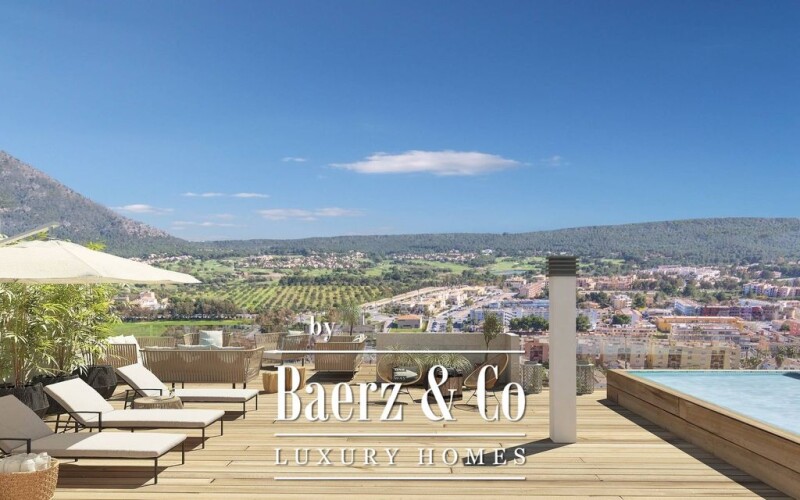 This luxury penthouse will be located in a newly built complex, which will consist of 24 apartments and will be divided into three blocks. This penthouse has a large terrace with private pool and partial sea view, as well as a parking space in the underground garage. A community pool is also included in the perfect residential community. The complex is located on a hill, above the village of Santa Ponça with magnificent panoramic views of the mountains and the sea. The property will have a living and dining room with open kitchen, four bedrooms, three bathrooms, a utility room and a south-east facing terrace. An underground parking space is included in the sale price. Large terrace with private pool, partial sea view, community pool, underground parking space, air conditioning, underfloor heating, elevator in the building, high quality building materials and craftsmanship with good energy efficiency. Santa Ponça is located in the exclusive southwest of Mallorca and is considered one of the most desirable places on the island. With its three golf courses (Santa Ponsa Golf I, II and III), Santa Ponsa is especially popular with golfers. In addition to a small bay, Santa Ponça also has a beautiful extensive sandy beach with a length of about 600 meters. Here you will find a variety of restaurants, bars and cafes, as well as various shopping opportunities for young and old. The exclusive marina of Port Adriano can also be reached in just a few minutes by car.