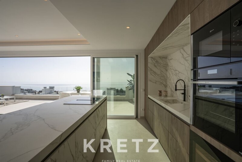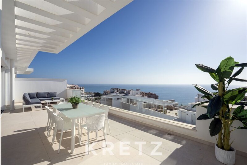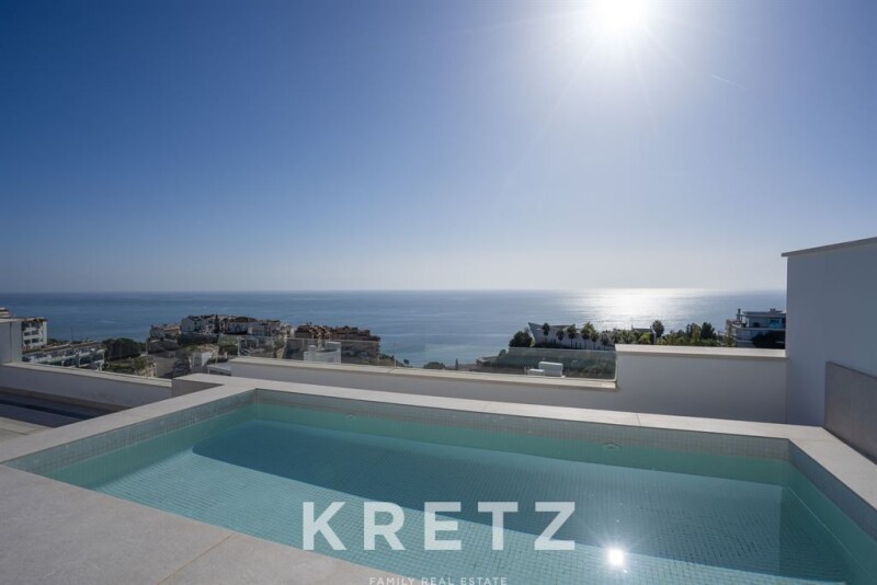 Exclusive listing. Benalmadena Costa Penthouse duplex of 276m2 with panoramic sea view & private pool. Large and bright living room, open-plan kitchen with central island, top-of-the-range materials and appliances, large bay windows and spacious terrace with sea view. 2 in suite bedrooms with walking closets. Upstairs, private rooftop with private pool, bar and panoramic sea views. 1 cellar, 2 parking spaces and domotic control.