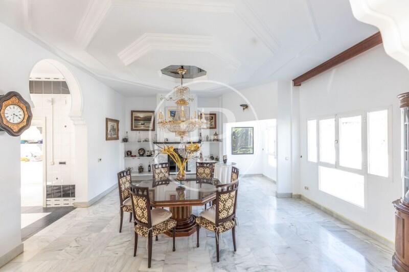This spectacular villa was built in the 90s, in a particular Arabic style, distinguished by a large number of details such as arches and columns typical of this style, with wrought iron railings and solid wood details, huge crystal chandeliers, marble floors and mosaic walls. The 573 square meters built are distributed in 5 levels as follows: In the basement, the 50 square meters serve a generous garage and storage room. On the ground floor we have two individual apartments, each consisting of a living room with an open kitchen, a bedroom and a bathroom. There is the possibility of joining both apartments through an interior patio. On the first floor we find an impressive hall, with marvelous columns, arches and a ceiling with a design characteristic of the Arabic style, which leads us, on the one hand, to a living room and a large office with a fireplace and access to 2 terraces and on the other hand, to a huge kitchen, with its own pantry, which communicates with a bright dining room, which also has its fireplace. On the second floor we find the 4 bedrooms, each one with its own bathroom, fitted wardrobes and an individual design with walls covered in silk, or decorated with the planets of the solar system. On the last level we find a barbecue and chill out area with sea views and the possibility of building a pool (according to plans). A laundry is also located here. This property has the ability to fascinate even the most critical eye, and in addition to the fact that it would make a fabulous residence, it also has the ability, because of the way it was compartmentalized, to be transformed into a boutique hotel (requires a license) being so Also an investment opportunity. If you want to take advantage of this special opportunity to be the new owner of this fabulous house, do not hesitate to request a visit!.