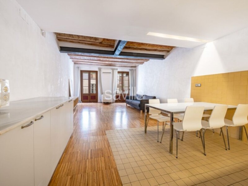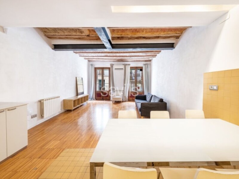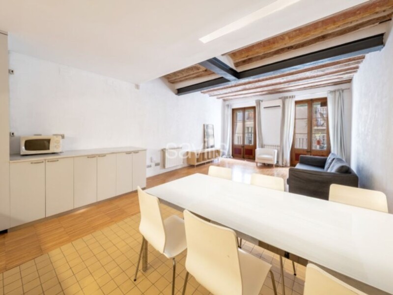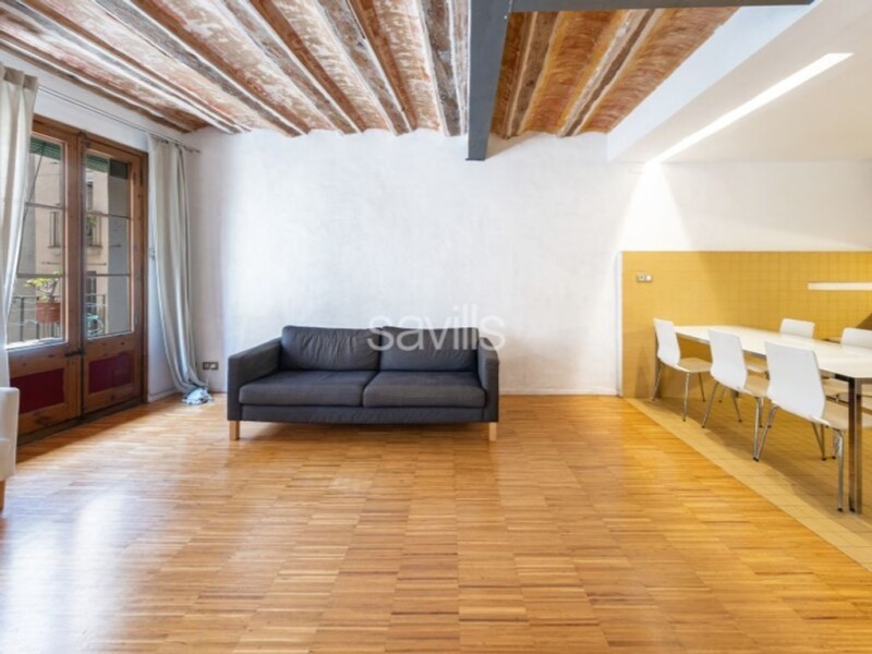 Savills is pleased to present this magnificent flat located in a 1900's estate in the vibrant Born neighbourhood. Situated on a first floor with no lift, this home combines historic charm with modern comforts. The flat, which was refurbished a few years ago, is in perfect condition and offers an ideal layout. During the renovation, original features such as Catalan vaulting, beams and wooden carpentry were maintained. Upon entering, you are greeted by a spacious and bright living room with open plan kitchen, perfect to enjoy moments with family or friends. From the living room, you have access to two balconies that overlook Sant Pere mes Alt street, providing an additional outdoor space. The property has a cosy double bedroom and a complete bathroom with a modern design. In addition, there is an impressive en-suite bedroom of over 40 m², which includes its own bathroom and access to a private balcony, creating a personal oasis within the home. Thanks to its double orientation, the flat receives abundant natural light throughout the day, creating a warm and welcoming atmosphere. Equipped with air conditioning and heating, this home guarantees comfort in all seasons. This flat is a unique opportunity to live in one of the most emblematic neighbourhoods of the city, surrounded by history, culture and a vibrant urban life. Don't miss the chance to turn this charming space into your new home. Contact Savills for a visit.