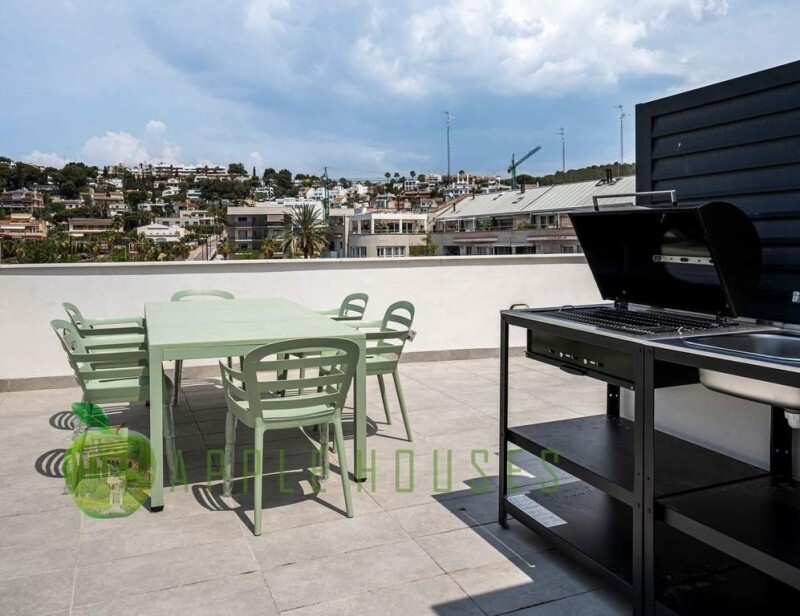 This spectacular newly built corner penthouse is characterized by its exterior spaces, style and light. The interior is designed in a modern and minimalist style that enhances the elegant feeling of space. It consists of a large living-dining room and modern integrated kitchen, fully glazed, with plenty of natural light and with access to the 65m2 corner terrace, two double bedrooms, one en-suite (fitted wardrobes lined with melamine) and another complete bathroom. All the rooms are exterior, with access to the main terrace or have their own balcony. The jewel in the crown of this penthouse is the large solarium terrace for private use at the top of the building. With stunning unobstructed views and the sea in the background, this terrace is equipped with a barbecue and is prepared for the installation of a swimming pool, making it a perfect oasis to relax and enjoy the sun and the sea breeze. It is located in the northern part of La Plana, a quiet area 8 minutes walk from the centre of Sitges, train and bus station. It is surrounded by a park, promenade and all the services: supermarkets, pharmacy, restaurants, sports areas and horse riding. In short, this newly built penthouse is a real dream for those who are looking for a quiet life on the Mediterranean coast. With its exceptional features and its location in the beautiful town of Sitges, this flat is a unique opportunity not to be missed.