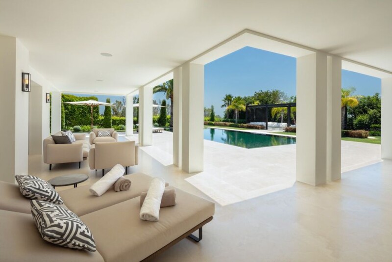 Frontline golf family villa for sale with views of the Los Naranjos golf course, built on a flat plot, with a beautiful terrace, tropical garden and heated pool. This property is beautifully presented, built to good standards and great attention to detail. It has a beautiful circular drive and a garage as you approach the imposing entrance of the house. On the entrance level you have an open plan kitchen with dining and breakfast area, a formal lounge and dining room, various seating areas, 2 en-suite bedrooms and an informal TV room which could be converted into additional accommodation. From the kitchen there is access to a semi-basement where there is an additional bedroom suite, laundry room and storage room. On the upper floor you have 3 additional bedrooms that share a sunny terrace with views of the golf course (the master bedroom has its own dressing room and jacuzzi).
