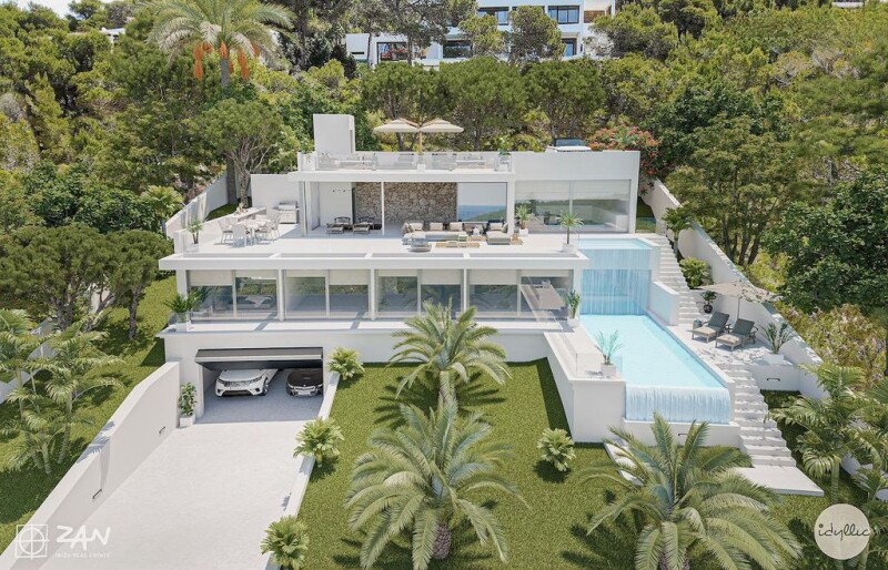 New to build 5 bedroom villa for sale in Cala Salada, Ibiza, Spain. This new to build 5 bedroom villa is located in a quiet area and close to the beach of Cala Salada. Situated only a few minutes from the beach and offering an amazing sea and mountain view with sunset. Set on a plot of 980m2 and with a house of 315.69m2 plus a large basement of 169.82m2 divided over 3 floors plus roof terrace. On the lowest level we find the basement. The first floor is for the 5 double bedrooms with ensuite bathrooms and all with access to a terrace that leads to the swimming pool. A nice detail is that the 5th bedroom looks into the swimming pool which gives an amazing effect into the room. On the second floor we find the living area with open plan kitchen and guest toilet. From this level we have access to the terrace with a outdoor kitchen and another pool. On the roof terrace there is a nice chill out area and bar area. On the other side of the roof terrace there is a parking space for a large car. As there is the possibility to access the house from the lower part of the house as well as from the top of the house. Furthermore there is underfloor heating and a elevator. The villa will be ready before the summer of 2024. Please contact us for more information, pics and floor plans.