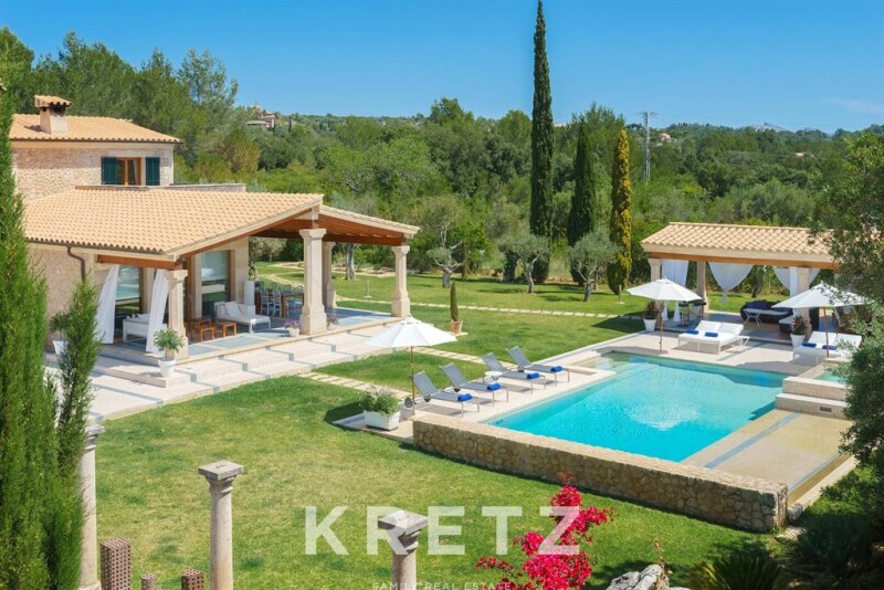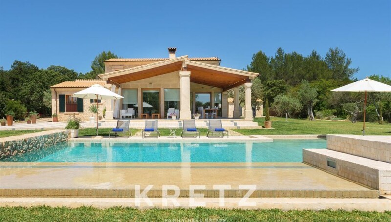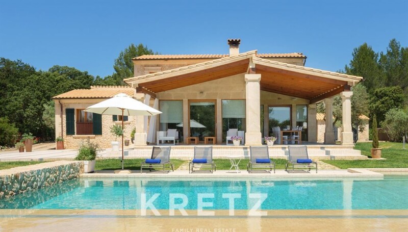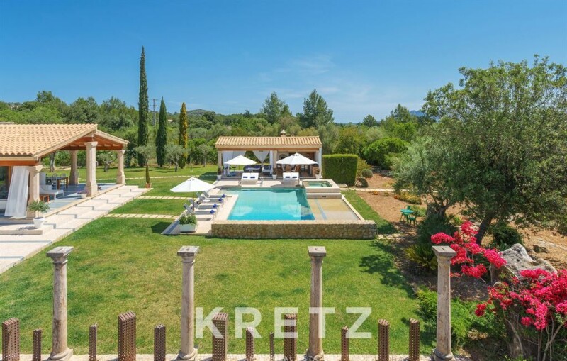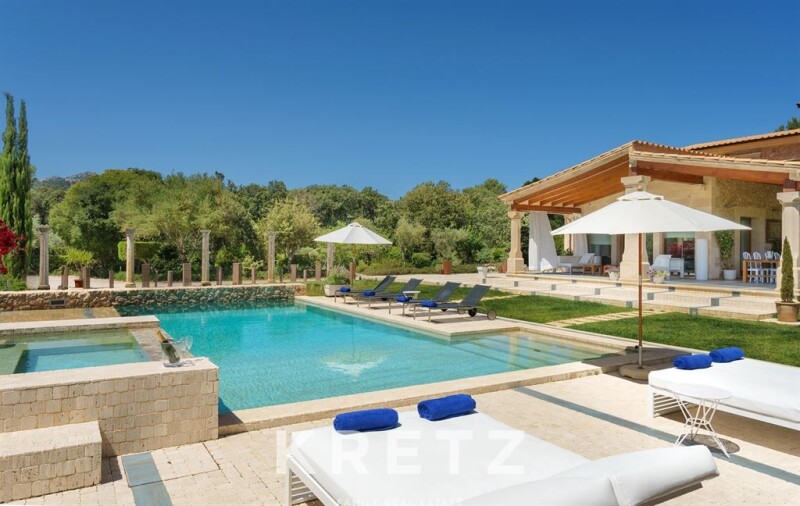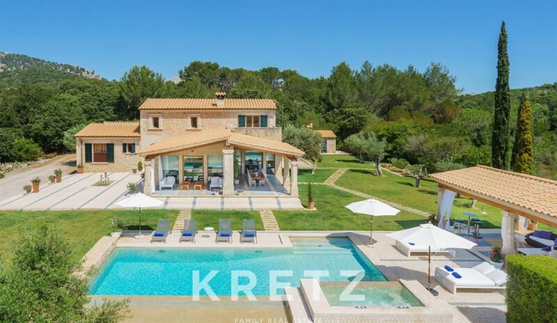Mallorca, Pollença. 410m² villa with a pool, jacuzzi, and 3 terraces on a wooded plot of over 15 hectares near a prestigious golf course. The ground floor features a bright living-dining room with large windows opening onto the porch, a fully equipped modern kitchen, 3 bedrooms with en-suite bathrooms, a laundry room, and a pantry. On the upper floor, there is a master suite with a walk-in closet, a bathroom with a shower and jacuzzi, and access to a private terrace. A wine cellar is located in the basement. This property is set in a peaceful and natural environment, close to beaches and local attractions such as the Cap de Formentor or the Calvari Steps in Pollença.