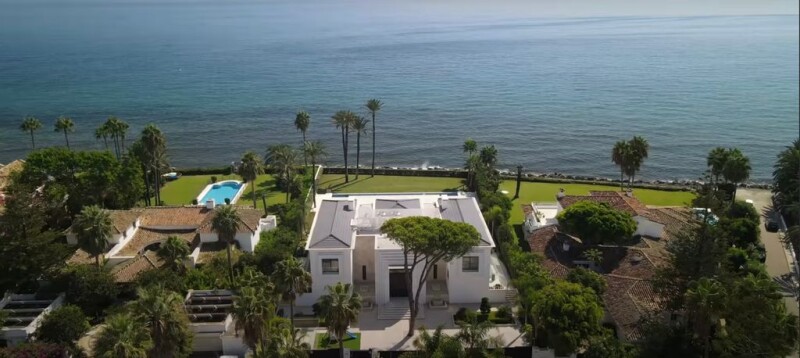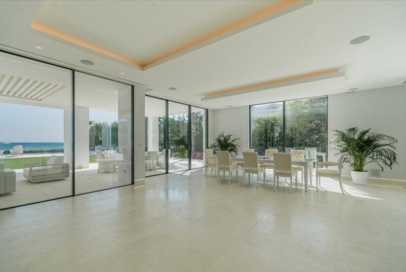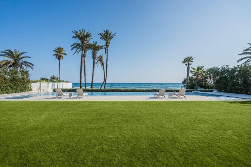 This new frontline beach villa for sale in Marbella is located in a quiet urbanization with 24-hour security, subtropical gardens and fantastic views of the Mediterranean Sea, the coast, the mountains and the picturesque golf course of the Real Club de Golf de Marbella. Guadalmina (Guadalmina Royal Golf Club). Surrounded by mature palm trees and similar high-end properties, the house boasts the most idyllic setting and stunning panoramic sea views. The white scheme, so often used in contemporary architecture in that part of the world, creates a stark contrast to its lush green surroundings, deep blue sea and light blue horizon. Built to the highest specifications, the house has its own unique style that reflects today's architecture with elements that emphasize the most progressive concept. Located on a 2,500m² plot, the 1,500m² modern mansion features remarkable living, dining and entertainment areas with glass doors and expansive windows that flood the interiors with natural light while marrying nature and architecture. Facing south, it welcomes you with an outstanding entrance hall with a wow factor. Consider it your chance to surprise guests. The elegant lobby with double height ceiling, exquisite lighting solutions, marble floors and bespoke double staircase with glass balustrades introduce the strong personality of your home. Spectacular views through the living room, terraces, a lawn separating the property from the water, a swimming pool and beyond to Africa set the mood and tone for the entire home. The outstanding ecological property is located in a very special place that awakens an extraordinary sense of freedom and the joy of living by the sea. Playing with grand scales and fabulously elegant and versatile shades of white, the 9-bedroom mansion features spacious formal and informal living and dining areas, a grand gourmet kitchen of undeniable elegance, indoor and outdoor heated pools, spa, sauna , multiple outdoor seating areas , private garage - all the trappings of a luxury home! Truly luxurious interiors make every penny worth it! Modern design implies practicality and this stunning villa follows that principle to a certain extent. Light-filled minimalist interiors with clean silhouettes squarely focus on contemporary aesthetics, clean architectural lines and sophisticated lighting. An effortlessly privileged lifestyle boasts lavish luxury features and cutting-edge technology. This state-of-the-art ecological property is located in a special location that awakens an extraordinary sense of freedom and the joy of living by the sea. It is ideally located in a well-established area, close to magnificent golf courses, international schools, blue flag beaches and all the best amenities that the most prestigious area of southern Spain has to offer. It is an ideal property for those who prefer and can afford to buy an exclusive mansion in one of the most desired places to live on the planet, with beautiful landscapes, unforgettable views, relaxing atmosphere and the best climate in continental Europe.