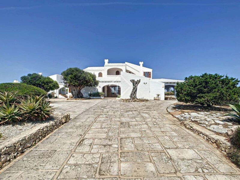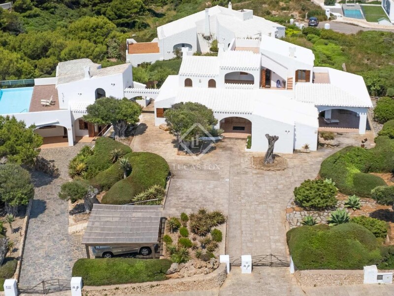 This magnificent 478 m² villa built on a 3,963 m² plot is located in the prestigious development of Cala Morell, belonging to the municipality of Ciutadella de Menorca. The main house is distributed over two floors. At the entrance we are greeted by a spacious hall/ hall with a wood-burning fireplace that leads us to the right, to a corridor with a guest toilet and two double bedrooms with private bathroom. To the left it leads to another double bedroom with a private bathroom, all with built-in wardrobes. Through the hall we enter the dining room and spacious living room with a wood-burning fireplace and large windows that enjoy magnificent views of the sea, with access to the comfortable covered porch furnished with high-quality teak furniture and identical views of the sea and the garden. of olive trees From the dining room we reach the spacious, very functional kitchen with access to a utility room and a covered terrace. Returning to the entrance hall and through a staircase we reach the first floor where we find a 60 m² space that houses a living room, and the master suite with a private bathroom in travertine with Jacuzzi and Italian shower, a large dressing room and access to two terraces with impressive views of the sea and access to the roof terrace that overlooks the cove at 360 degrees. In an independent annex located on the property and on a lower level we have three double bedrooms, each with a private bathroom, two of them in travertine, and a large garage that can easily accommodate three vehicles. The house has high-quality finishes, high marés ceilings with exposed wooden beams, ceiling fans in all rooms, teak interior and exterior carpentry, alarm system, installation of air conditioning and heat pump in the living-dining room., and "A" energy efficiency certification. Above this unit we find a large 43 m² pool, surrounded by a huge 113 m² terrace partially covered with a barbecue area, dining room and living room that enjoys a wide view of a green area of unbuildable pine trees, and the sea. . The property has a wonderful garden with olive trees and a pine forest to take short walks and relax in the shade of the pines on very hot summer days. Without a doubt, an exclusive property to live all year round, or spend long periods of tranquility with family or friends. Contact us for more information, or to arrange a visit.