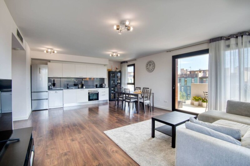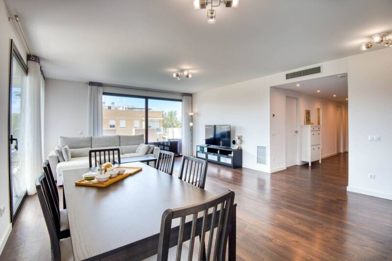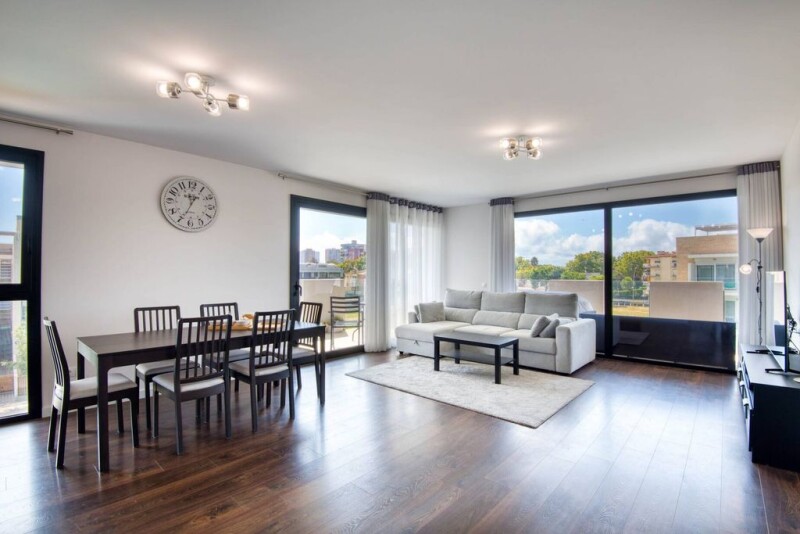 Stunning penthouse, located in one of the best communities of Playa de Aro, just 300 meters from the main avenue and leisure areas. The apartment has an entrance hall, living-dining room with access to a magnificent terrace, fully equipped kitchen, two double bedrooms, a bathroom, a suite with bathroom and private terrace and a laundry room.