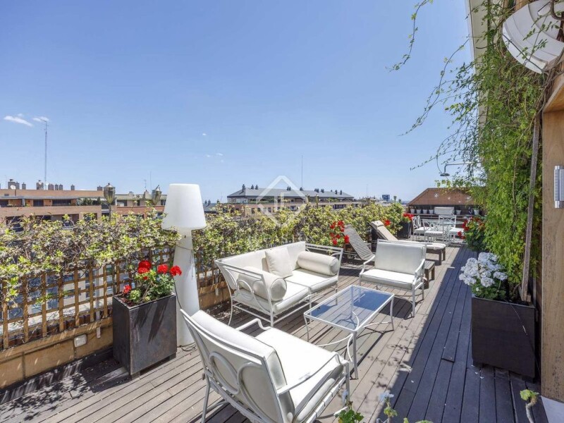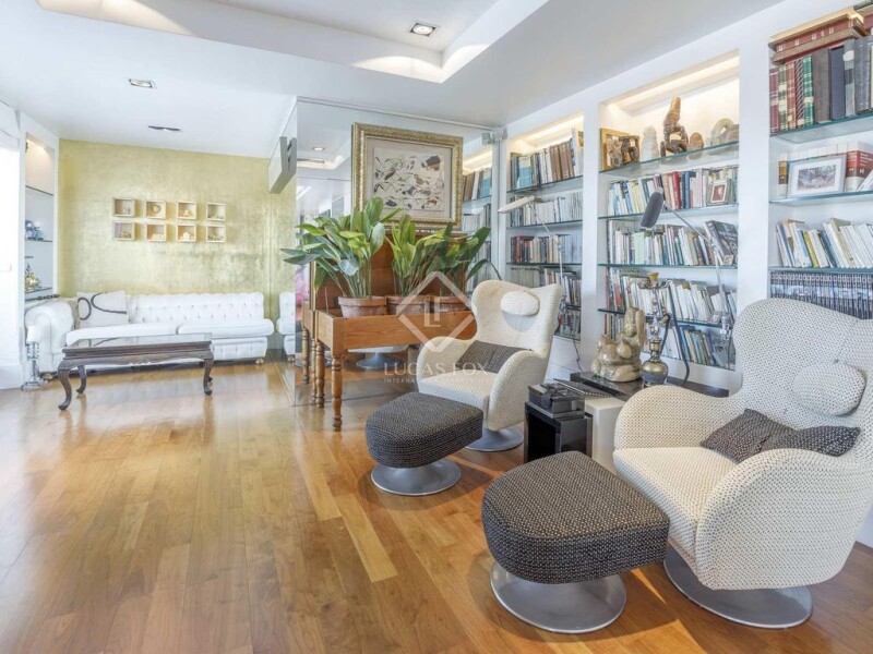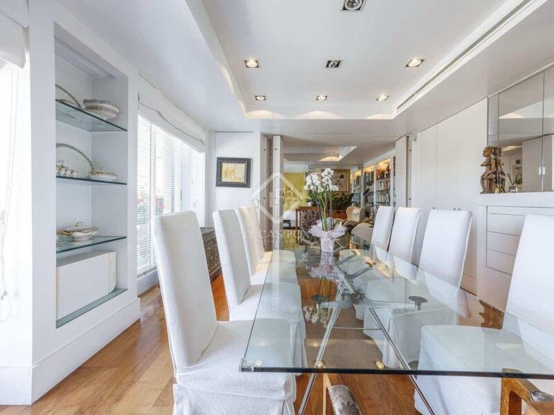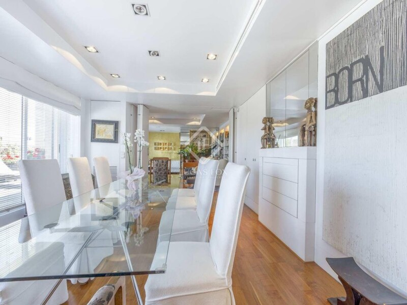 Lucas Fox presents this spectacular duplex penthouse for sale in the City of Arts and Sciences, with access to both floors with La Finca 's lift and by a staircase from inside the property. The property is very exclusive in the area due to its large area of 360 m², plus another 100 m² of terraces, the product of the union of two penthouses in the same building with a swimming pool and two parking spaces included in the price. Upon entering the property through the day area, a small hall gives way to the large three-room living-dining room , with access to the covered and open terraces, which gives the property abundant natural light. The rooms can be closed and left completely independent, thanks to the mobile folding walls that separate them, to make each room a unique space for music, eating or enjoying reading by the fireplace. From the living room, you access one of the terraces on the left, in this case the covered terrace with a sliding roof and large windows that allows you to enjoy this space both in summer and winter. To the right of the living room, another large terrace with sun loungers, shower, platform, sofa area and exterior kitchen make this space the ideal place to spend spring and summer nights. Next to the living room, there is a practical kitchen with an island, connected to the utility room and with access to another terrace overlooking the pool and southerly aspect. A guest toilet completes the floor. Next to the entrance hall, a comfortable staircase connects us with the night area that stands out for its five bedrooms with each private bathroom and an study/bookstore. The main bedroom has a whirlpool bathtub and two sinks, an open dressing room, a shoe rack and large wardrobes, making it very practical and has a large storage capacity. Next to this, there is an study/bookstore with large windows and a single bedroom with a bathroom that can be used for service. A beautiful hallway with paintings and a large mirror leads to three more bedroom : a bedroom with a double bed and bathroom and two bedrooms with a private bathroom and large desks, one of them with a sauna shower and a small gym. Get in touch for more information.