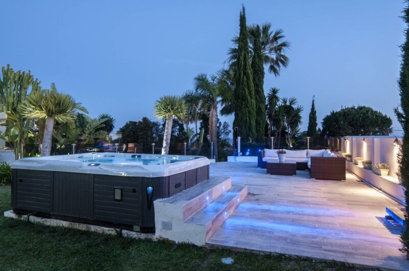 Villa Serena: luxury sea view vlla for short-term rent in Marbella East Welcome to Villa Serena, a magnificent luxury villa located in the serene Elviria area of Marbella East. This private oasis offers breathtaking panoramic sea views, stunning scenery, and a tropical atmosphere. Just a short drive away, you'll find renowned destinations such as Nikki Beach, Ocean Club, and Puerto Banús. Villa Serena is not only a remarkable holiday rental, but also an ideal venue for special events such as weddings, anniversaries, and birthdays. With 8 beautiful bedrooms inspired by Versace, this villa can comfortably accommodate up to 15 guests. The villa features spacious living areas, a gourmet kitchen, a fully equipped gym, and a games room. Additionally, an onsite separate apartment provides 2 extra bedrooms for added convenience. One of the villa's main highlights is the exquisite pool area. Set on a 3000 m2 plot, it boasts an infinity swimming pool seamlessly blending with the Mediterranean sea, a 10-seat jacuzzi, a poolside bar, and an outdoor dining area. As the sun sets, the high-end lighting creates a captivating ambiance, making your stay akin to a private hotel experience.