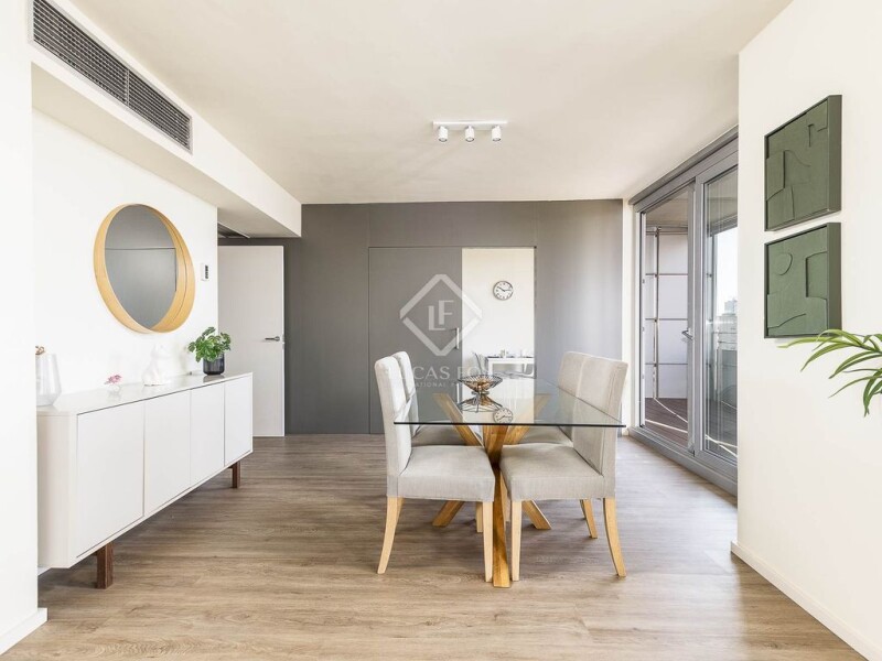 Diagonal Mar Towers - Illa del Cel enjoys a prime location in Barcelona, situated next to Diagonal Mar Park and just a short walk from the beach. This vibrant area offers an abundance of restaurants, leisure services, and sports facilities. We find this 133 m² apartment for sale with an 18 m² terrace on the second floor. The apartment enjoys plenty of natural light and has a layout that consists of a living-dining room with a separate kitchen and a terrace. In the sleeping quarters there is a double bedroom, a single bedroom and a bathroom. As it is newly refurbished with high-end fixtures and finishes, the apartment is presented in impeccable move-in condition with a parking space included in the price. The development also offers an extensive range of shared amenities, including beautifully landscaped gardens, a 180m² swimming pool, a solarium, a children's area, and a fully-equipped gym with a swimming lane. Additionally, 24-hour security provides peace of mind, allowing residents to truly relax and enjoy their surroundings. Diagonal Mar is one of the most sought-after areas in Barcelona, known for its tranquil environment, wide streets, and excellent leisure options. Well-connected by public transport, including Metro L4 - Selva de Mar, trams, and buses, it is also easily accessible by car. The neighbourhood offers well-planned streets, scenic park walks, and cycling paths, making it ideal for exploring on foot or by bike. Located just minutes from iconic attractions such as El Born and La Barceloneta Beach, and with excellent access to the city's key monuments, Diagonal Mar Towers - Illa del Cel is the perfect place to build a life in Barcelona. The pictures represent the show flat of same typology on the fifth floor of the building. Please contact us for further details or to arrange a viewing.