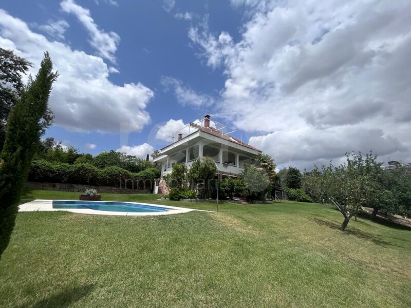 Villa located in the urbanization Santo Domingo, a residential housing development located 28 km from Madrid center and 24 minutes from Adolfo Suarez Airport. Madrid center and 24 minutes from Adolfo Suarez Airport. The magnificent Independence is located on a nice plot within the urbanization Santo Domingo, ideal for large families, and can be converted into two separate dwellings. The house, with great quality in terms of construction and materials, can be divided into two; the entrance floor and the first floor would form one, and the first floor, above ground, the other. This last floor has been recently renovated to accommodate four bedrooms (three doubles and one single), two bathrooms, a large kitchen, a room that serves as a storage room or cellar, and a nice living room with a fireplace to which three windows provide access to the porch and pool. This floor is all above ground, taking advantage of the slope of the land, and has direct access from the outside. The main floor, with entrance from the street, leads to what would be the "other dwelling" with the following distribution: a large entrance hall with double height, which leads to a cozy living room with fireplace and exit to a wide and bright "L" shaped terrace. Next is the dining room, which has direct access to a large kitchen, with a separate laundry area on one side and a living room with a fireplace on the other, which can also be used as a dining room. On this level, there is also a guest bedroom with an en suite bathroom, a guest toilet, and a pantry. The second floor has three bedrooms, each with an en-suite bathroom. The master bedroom also has an adjoining living room with a fireplace and a large terrace. The other two share a spacious dressing room. The plot is very well designed, with a wonderful salt swimming pool and large green areas, as well as numerous species of well-established trees and an extensive orchard area. The garage has a capacity for three cars. A couple of other vehicles can be parked in a covered area in front of the garage, where there is also a wooden shed for storing tools. The heating is by natural gas (with a new boiler). There is an independent meter for the consumption of the first floor (in addition to an exclusive light switchboard for that level). The property has air conditioning and electric blinds in several rooms.