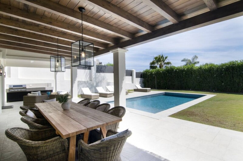 Beautiful private 3-bedroom villa in Nueva Andalucia for Sale Welcome to a beautifully presented 3-bedroom villa for sale in the prime area of Nueva Andalucía in Haza del Conde. A classic Andalucian villa, with tasteful modern interiors, is ready to welcome you in. Situated on a nearly 900m2 plot, this villa is private, cosy, and has many great features to offer. This magnificent property offers bright modern interiors, that are tastefully decorated with a great balance of modern and classic styles. The villa has generous bedrooms, and beautiful outdoor dining and chill-out areas, as well as a private pool and garden, with a dedicated grill area. Above else, on the rooftop, you can find a sundeck area with sunbeds and cosy sofas, perfect for enjoying the sunny Marbella weather. The surrounding vegetation makes the villa feel extremely private, excluding you from the outside gazes and allowing you to enjoy your privacy. Ideal property for family living or holiday stays near the best golf courses of Marbella. Here are 5 key features of the villa: Renovated Modern Interiors: The villa has been fully renovated with bright, modern design elements, including double-height ceilings and an open-plan layout. Prime Location: Situated in Nueva Andalucía, it's within walking distance to Los Naranjos Golf, making it ideal for golf enthusiasts and those seeking a central location. Outdoor Living Spaces: The property offers a private garden with covered terraces, dining and chill-out areas, a BBQ, and a private pool for outdoor enjoyment. Spacious Roof Terrace: The villa includes a large roof terrace of nearly 100 sqm, offering panoramic views of the mountains, golf course, and surrounding areas. Private Bedroom Wing: The 3 double bedrooms are located in a private section of the house, with the master bedroom offering direct access to the garden.