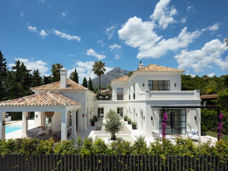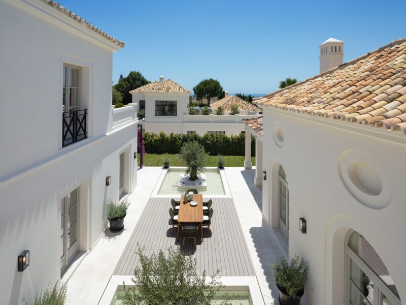 Brand new villa offering exquisite design, top quality finishes and easy access to all amenities of Marbella Golden Mile. Elegant resort style property with classic architecture and exquisite attention to detail. Naguelles is a leafy green area of Marbella, perched above the famouS Golden Mile. The residential area is highly sought after as it is surrounded by some of Marbella’s most desired amenities and yet the area retains a peaceful ambience. The quieter residential roads are fl agged by mature trees and weave up a gentle incline. The area has Nagueles park; 10.000 hectares of pine, olive and carob trees where you can lose yourself in nature. Five minutes from Nagueles is Marbella’s Golden Mile, the epicentre of luxury. Stretching over 2km from Puerto Banus to the edge of Marbella town, the area has some of the most expensive properties, exclusive restaurants and shopping and a beautiful promenade along the beach. Nagueles Villa is within easy reach of the main highway connecting the area to the rest of the Costa del Sol. International schools, sports a health facilities are minutes from the property also. A N A M B I E N C E O F TRANQUILLITY Nagueles Villa is a utopian setting, where you can escape and unwind. The home is cocooned within olive trees, lavender and water to calm the senses. Newly built, the villa offers exceptional quality and delivers a French provincial style; classically styled architecture and built around the central entertainment space. Olive trees and water features fl ank this exterior seating area and soft lighting creates a romantic evening. Covered porches create a shaded area to relax and hot pink bougainvillea wrap around the terrace, embracing the Mediterranean climate. There is off street parking for a couple of cars on the drive- way and an impressive entrance to the property is fl agged by sculptured plants. Manicured gardens and several seating and dining areas offer a generous space for entertaining and there is a large swimming pool for cooling off on the hazy summer days. The property resides on a plot of over 1.000 m2 and an ample built size of 566 m2. OPULENT, RETREAT-STYLE LIFESTYLE Nagueles Villa offers calm, serenity and opulence in equal amounts. The home has been designed to create a personal oasis, a place to unwind and relax in the heart of Marbella. The villa is centred around a south of France styled courtyard and an abundance of olive trees and lavender, which create an elegant resort feeling. South facing, it enjoys the best of the Mediterranean climate. A S T Y L I S H P A L E T T E O F O L I V E G R E E N S AND NEUTRAL TONES An impressive front door of Iroko wood greets you at the porch and on entering the home, high ceilings, ample light fl ooding the property create an instant feeling of calm. The fl ooring is wooden, in a classic whalebone pattern which compliments the décor and architecture perfectly. The accents of olive green combined with neutral tones have an instantly soothing effect. Across the entrance hall, the main living room boasts chic interior design; fl ooring of white Caliza stone and walls of olive green and soft aesthetic furniture. The windows have timeless curves and the beamed ceiling of over 4m in height gives further character and an air of grandeur. The room is fi lled with light and enjoys views across the gardens and out into the central courtyard. The well-appointed kitchen has quality Miele appliances and plenty of storage and preparation space. The cabinets are a sleek, contemporary style and the windows and shelving have a matte black colour. An exterior seating area and BBQ area extend the cooking and dining options even further. has a total of five bedrooms, with two located on the ground fl for. Decorated in neutral tones with accents of olive and quality aesthetics such as wallpaper and both bedrooms enjoy view.