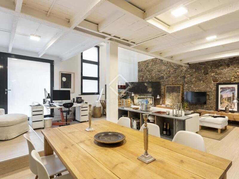 In a classic building from 1900, we find this 152 m² loft apartment. The lower floor consists of a large living-dining room that opens onto a very good quality open kitchen, as well as a complete bathroom with a shower at the entrance. The original ceilings in this space are approximately five metres high and feature Catalan wooden vaulting and iron beams with forged pillars. The original stone wall was recovered from the Roman quarry of Montjuïc. Likewise, the apartment is equipped with large windows and doors with double glazing, which acoustically and thermally insulate the home, as well as having a high-end anti-breakage system. The upper floor houses the main double bedroom with access to a 10 m² terrace, which opens onto a very nice south-facing courtyard with lots of greenery. This level is completed by a complete bathroom with shower and a second double bedroom that is currently used as an office.