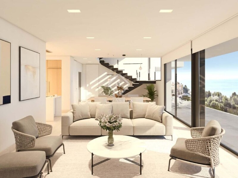 Villa Aura is located in one of the most desirable areas of Altea, combining cutting-edge technology, comfortable interiors, energy efficiency and materials that enhance light and space. The property, with 360° views of the sea and the Benidorm skyline, is located in a privileged area of Altea la Vella in Azure Altea Homes, one of the most emblematic enclaves of the Costa Blanca North. The architecture, with its modern and functional lines, is designed to allow the spaces to breathe and open up to the large terrace and swimming pool. Light, air, sea and vegetation make it clear that the style adapts to the landscape and integrates with it. It is built on three levels, access is via the highest level, which houses the garage and the hall of the house, equipped with a lift, so that movement between levels is comfortable. The middle floor houses three bedrooms, all with en-suite bathrooms and access to a terrace to enjoy the sea from every room of the house. On the main floor is the fourth bedroom of this villa, also with direct access to the terrace and the entire day area, a large open plan living room connected to the kitchen, the terrace and the swimming pool. Villa Aura is much more than a magnificent property next to the Mediterranean, it is an efficient villa equipped with heating, air conditioning and hot water system by Aerotermia, installation of photovoltaic panels, electric car charging point and home automation system to be always connected to your home. The outdoor spaces, built on different levels, allow stone and native plants to play their decorative role, while integrating perfectly with the surroundings. Pure architecture in a unique setting awaits you at Azure Altea Homes.
