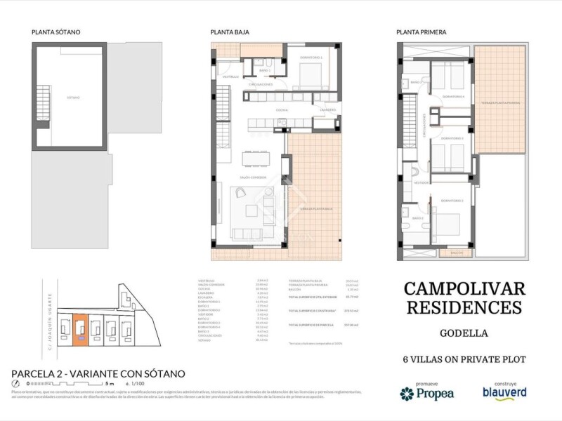 This property is part of the Campolivar Residence development , a new build of an exclusive residential complex of six luxury single-family villas. The villa has a total constructed area of 272.53 (with basement option) and 233 square meters (without basement option), and sits on a plot area of 557 square meters. It consists of a ground floor, first floor and basement (optional). On the ground floor there is a spacious dining room living room with access to a terrace, the dining room living room leads to an open-plan equipped kitchen, next to the kitchen a utility room. The ground floor is completed with a double bedroom with an en-suite bathroom and a lobby that corresponds to the main bedroom, from which you can access a balcony. The first floor consists of three double bedrooms, one of them with an en-suite bathroom and an open dressing room, another full bathroom serves the other two rooms, from two double bedrooms there is access to a private terrace. Optionally, a floor of approximately 30 m² ventilated with natural light through a skylight is offered. Among its features, it is worth highlighting the homes' porcelain stoneware flooring, floor-to-ceiling white lacquered interior doors, white lacquered wardrobes with wood interior paneling, and a reinforced security property door. The homes also feature Cortizo aluminum frames with thermal break, Climalit-type double glazing, and safety glass exterior and interior railings. The bathrooms are tiled with high-quality porcelain stoneware by Pamesa or similar, and sanitary ware with concealed flush cisterns by Duravit or similar. The kitchens are equipped with built-in appliances : an induction cooktop, electric oven, and built-in microwave, as well as a refrigerator, dishwasher, and washing machine, all by Bosch or similar. The homes feature high energy efficiency: a ducted air conditioning system for heating and cooling, hot water supplied by aerothermics , and an Airzone system. They also have a home automation system to control lighting and air conditioning. The following options will be available free of charge: replacement of shower for bathtub, two kitchen cabinet and countertop colors, and two tiling options. Additionally, the following options are available for a fee: installation of a pellet-burning cassette fireplace , underfloor heating heating, photovoltaic installation on the roof, water softener, and the addition of SIMON 100 series automated electrical systems. Contact us for more information.