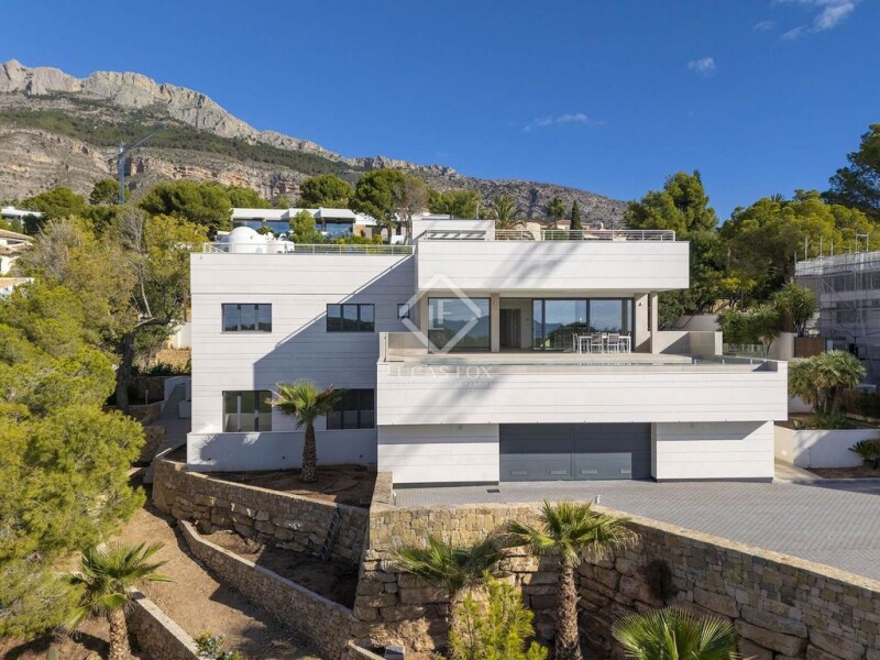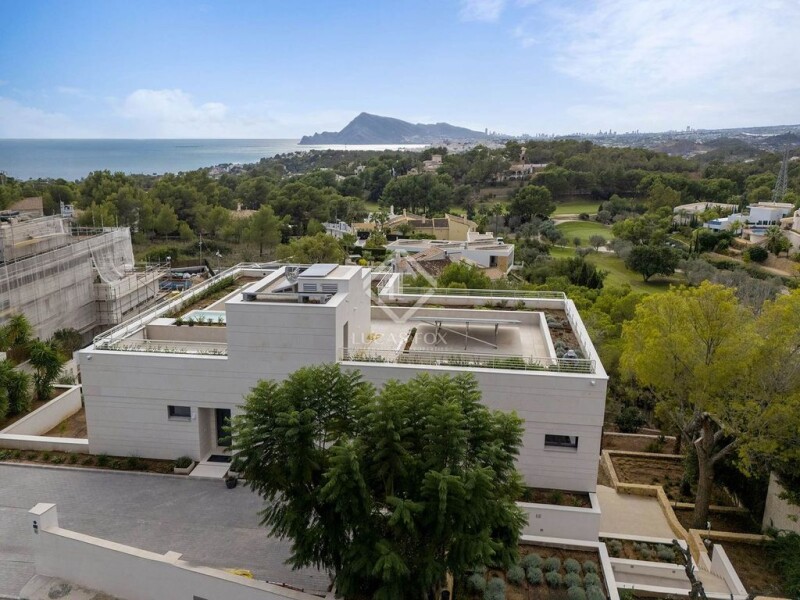 Lucas Fox is proud to present this truly exceptional residence in one of Altea's most prestigious locations. Situated beside the renowned Altea Golf Club and just moments from the charming village of Altea la Vella, this modern masterpiece offers a perfect blend of tranquility, breathtaking views, and superior craftsmanship. Designed with every imaginable luxury, the property includes premium features such as advanced exterior and interior insulation, a ventilated facade, a private lift, and an eco-friendly geothermal system for heating and cooling. Set on a spacious 2,173 m² plot with over 800 m² of exquisitely finished living space, this home is thoughtfully arranged across two levels. The main floor welcomes us into expansive living and dining areas and an elegant, open-concept kitchen that flows seamlessly onto a stunning 50 m² covered terrace. Here, a private pool and panoramic views provide the perfect oasis for entertaining or relaxation. The main level also includes a luxurious main suite with a dressing area and en-suite bathroom, along with two additional bedrooms, each with a private bathroom, ensuring comfort and privacy for all. The lower level, accessible by both lift and staircase, offers a self-contained guest suite complete with its own living and dining room, kitchen, two guest bedrooms with terraces overlooking the lush garden, and a guest bathroom. Additionally, this level includes a versatile space ideal for a gym, workshop, or creative studio. For convenience and functionality, the property features a garage with ample space for 4-5 large vehicles, a laundry room, pool equipment room, and a dedicated DIY area. Crowning this magnificent home is an expansive 200 m² rooftop garden, accessible by lift or stairs. Here, we find a solarium, plunge pool, shower, and guest bathroom, surrounded by lush flower beds and breathtaking 360° views of the mountains and the Mediterranean Sea. The surrounding gardens of the property are artfully designed with low-water-use landscaping, LED lighting, access gates, and a tranquil fish pond, all arranged on tiered terraces that enhance the home’s beauty. Completed with the finest materials and the latest technology, this exclusive residence offers a luxurious Mediterranean lifestyle in one of Altea’s most sought-after settings. We are delighted to present this exceptional property, embodying the best in modern design, premium quality, and timeless elegance. Please call us for further details.