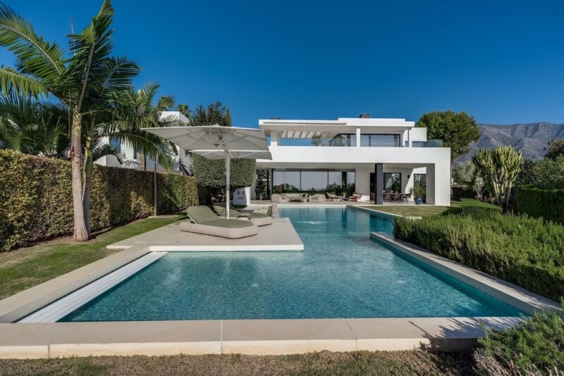 Magnificent contemporary villa with sea and mountain views in Las Lomas de Marbella Club on the prestigious Golden Mile Nestled in the prestigious gated community of Las Lomas de Marbella Club, this exceptional villa offers the epitome of luxury living on Marbella's Golden Mile. Set on a south-facing plot of 1,223 m², the property boasts breathtaking views of the iconic La Concha mountain. With modern architectural elegance, the villa features a striking white facade, a rooftop garden terrace, and meticulously landscaped gardens surrounding a private pool. Inside, the villa exudes contemporary sophistication. Spanning 868 m², it offers a spacious living area with integrated ceiling lighting, a seamless dining area, and a state-of-the-art sound system for indoor and outdoor entertainment. The kitchen is a culinary masterpiece, blending design and functionality with ample storage and a cozy dining corner. The five en-suite bedrooms include a luxurious master suite occupying the entire first floor, offering unparalleled privacy and comfort. Designed for relaxation and entertainment, the villa includes a dedicated entertainment room, home cinema, wine cellar, gym, and elevator. The property also features a three-car garage and optional property management services for worry-free living. Experience unmatched elegance and convenience in this extraordinary villa located minutes from Marbella's beaches, fine dining, and world-class amenities.