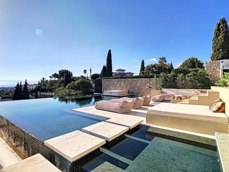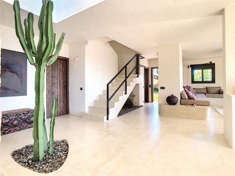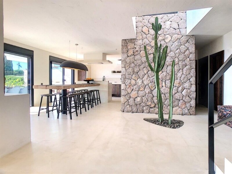 Refurbished designer villa with fabulous sea views from both levels, located in the popular area of El Paraiso Alto, Benahavis. The villa offers an entrance hall with guest cloakroom accessing the open plan living room with working fireplace, skylight tower with cactus, modern open plan kitchen with wooden dining bar, both accessing the large terraces with chill out zones and green infinity swimming pool. All floors and bathrooms are in polished concrete and the villa features new Air Conditioning hot & cold. The master suite on the top has a private terrace. Garage for 2 cars and a carport at the top of the entrance drive. Situated less than1 km from a tennis club, 2 km from the supermarket and the nearest restaurants and less than 2.5 km from the beach, this is a lovely holiday home or permanent residence.