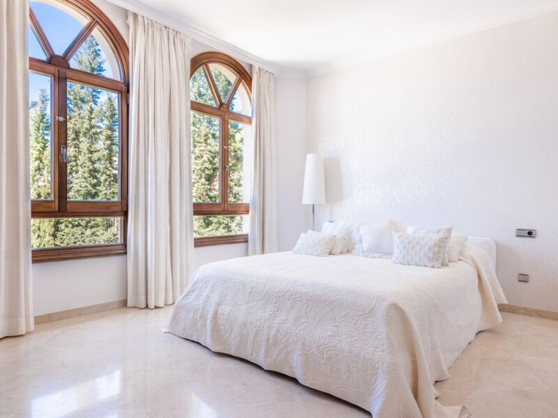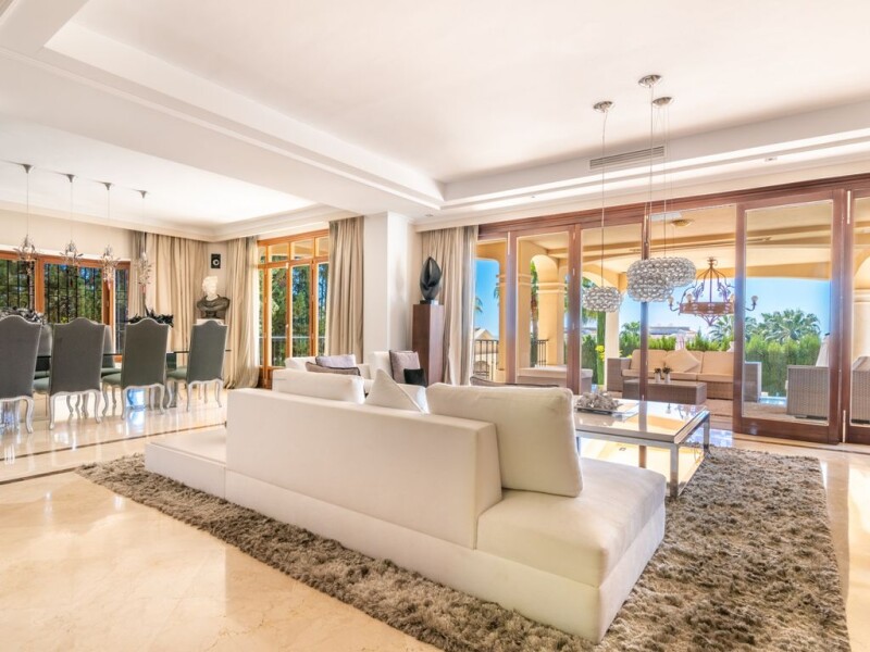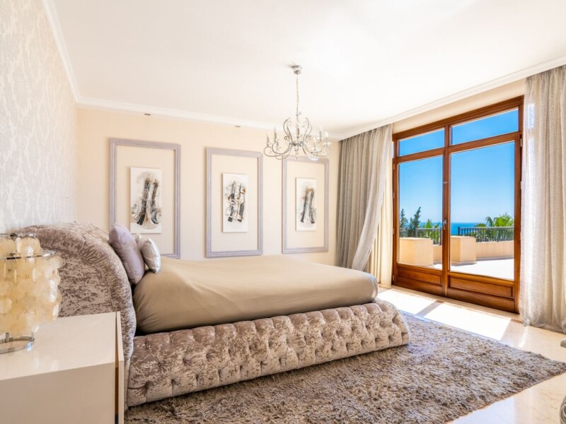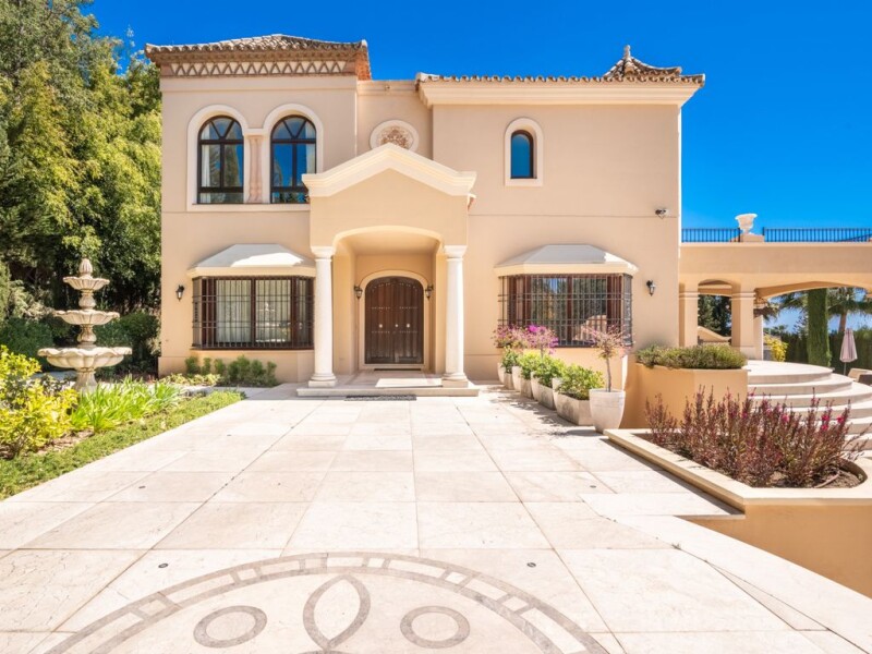 This perfectly proportioned villa is located in one of the most prestigious areas in Sierra Blanca. The large swimming pool is positioned on your right on entry to the villa. On the right before you reach the door of the property you can see the large stunning outdoor bar with its pull down cinema screen, perfect for those summer parties, completely private. On entry to the property you have, on the right hand side an intimate living room and on the left a large office with guest toilet next to it. Further, into the main hallway on the right is a large luxurious living area with windows that flush almost to the wall to create an indoor outdoor feel in the terrace with sea views. From the terrace, a staircase leads you directly to the outdoor bar area. On this level you will also find a dining room and kitchen. An impressive staircase on the left of the hallway takes you to the upper floor where are located 4 en-suite bedrooms, 3 with terraces and views to the sea, all immaculately decorated and with some very well thought through extras. On the lower ground level is a large well equipped gym, games room, full size pool table, storage room, double bedroom, guest bathroom and a good-sized kitchen. Entry to the double garage is also here. There is also enough parking on the drive way for 4 cars. The property has underfloor heating throughout and air conditioning. Beautiful marble floors and Traventino marble in the bathrooms. This is a marvellous villa with all the key elements for indoor/outdoor living, fantastic as a family home or to enjoy the Marbella social experience with friends.