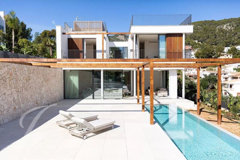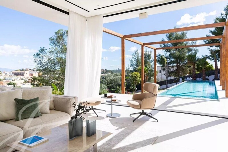 This contemporary villa boasts over 400 square metres of sophisticated living space that blur the lines between indoors and outdoors. Highlights of this exceptional property include a private pool, ample terraces, a central atrium that brings natural light into the interior, and underground parking for three cars. Built on gently sloping land, the property is surrounded by landscaped gardens with an infinity pool at the lowest point, terraces and living areas oriented towards the mountains and an open concept interior. The plant-filled atrium is at the heart of the ground floor, filling the space with natural light. Fanning off from it are the entrance hall and staircase, a pantry/utility room, one double bedroom with en suite bathroom, and a spacious open concept kitchen, dining and living room, arranged on split levels that match the tiers of terraces outside. Floor to ceiling glass along one side of the living area looks out on to the terrace dining and seating areas, making the most of the outdoor living potential. The first floor, which is also accessible via an exterior staircase, comprises three more double bedrooms and bathrooms. Two of these faces the atrium, ensuring plenty of light, and also have access to a shared terrace with views of the countryside. First rate construction, the finest materials and top-quality appliances will be used in this modern Mallorquin home. The continuous use of pale woods, natural stone cladding and an abundance of glass both inside and out, ties this property together aesthetically, ensuring it is warm, light and contemporary, whilst enjoying both proximity to nature and easy access to the Palma and the coast. Genova is the village located closest to Palma. Within just a few minutes’ drive from the hustle and bustle of the city you will find yourself looking down at the sea and forests which embraces this beautiful location. Genova with its village atmosphere and its narrow winding streets is located at the foot of the Na burguesa mountain range and has been inhabited since pre-historic times. It has a small church named after the patron saint of Genova, San Salvador. It also has an underground cave attraction which is the smallest cave system in Mallorca. Due to its elevated position Genova also has amazing views of the island that stretches for miles. There is a local fiesta in August to celebrate San Salvador, the patron saint of Genova. There are a surprisingly large number of restaurants to choose from in Genova including some with an excellent reputation. It’s certainly a good place to sample traditional Mallorcan and Mediterranean cuisine for example at the ever so popular restaurant Can Pedro with its amazing views from the rooftop terrace. The proximity to Palma as well as being close to many of the international schools on the island makes Genova a popular place to live for local and international residents alike.