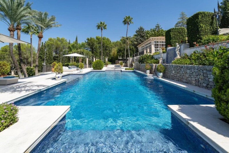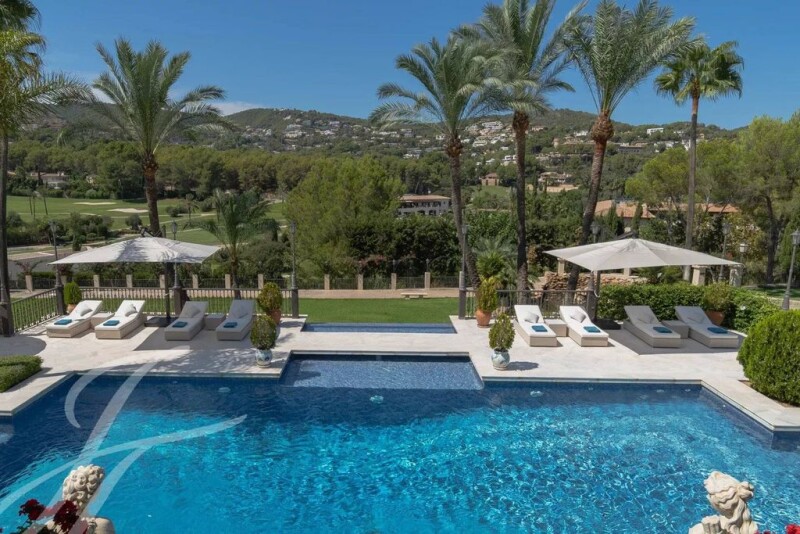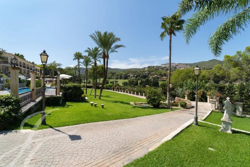 Perched majestically on a high, illuminated ring of walls, Castello M stands as one of the most iconic and prestigious estates in Son Vida, offering breathtaking views from almost every vantage point. This extraordinary property seamlessly combines neoclassical architecture with modern sophistication, featuring exquisite details such as a nymphaeum, classical statues, fountains, a cascading waterfall, and state-of-the-art smart home technology. Unparalleled Features of Castello M: Expansive Plot of 8,804 m² with a 3,200 m² constructed area and 2,500 m² living space. Luxurious Living Spaces: 10 spacious bedrooms and 10 en suite bathrooms. Resort-Style Amenities: A stunning swimming pool with waterfalls and illuminated fountains. A tennis court and a large open party lounge. A separate spa area with a jacuzzi, hammam, and sports center. Impressive Entrance: Accessed through a grand forged steel gateway and a long driveway lined with 11 towering palm trees. Entertainment and Wellness Spaces. At the entrance, you'll find a sports and fitness area with a gym, small kitchen, bathroom, and guest room, ideal for yoga or massage sessions. The BBQ house, featuring the unique "Linny's" bar, offers an open wood grill, wok cooking hob, and a large pizza stone oven—perfect for hosting gatherings. Adjacent to the villa, the Park di Sabine enchants with its fragrant jasmine orangery and a serene lake pond. The terrace is the perfect spot to enjoy a breathtaking sun-downer experience. Modern Conveniences and Sustainability: Additional features include a garage for four vehicles and two workshops. Three chimneys, gas central heating, and air conditioning. Smart home integration with WiFi, Sonos music system, and a security system with indoor/outdoor video surveillance. Sustainable living with solar panels, an electric car charging station, and a water treatment system. Castello M is more than a home—it's a lifestyle. Its exceptional design, luxurious features, and prime location make it a true gem in the heart of Son Vida. Son Vida – the epitome of luxury lifestyle in Mallorca was first recorded in the 13th century. The castle which was mentioned is now a famous hotel. The site started as a farming area and was developed by the Vida family. Nowadays it is a gated community with several golf courses, two five-star hotels, and a vast array of stunning properties with amazing views over the surrounding mountains and the bay of Palma. It has attracted famous visitors and royals and has been the home of celebrities, and golf and architecture lovers alike. It has easy access to all amenities like cultural events, cinemas, shopping, sports, and medical centers and it is only a stone´s throw away from the capital Palma. Famous beaches and their clubs are within a short drive and the airport is just 15 minutes away which also makes it attractive to commuters. Son Vida is divided into the newer and the older parts. In the new Son Vida, you will find stunning villas with purist and modern architecture and the more classical Mediterranean-style ones around the golf courses in the older part. So there is something for every taste in the selection of exclusive property in this unique enclave.