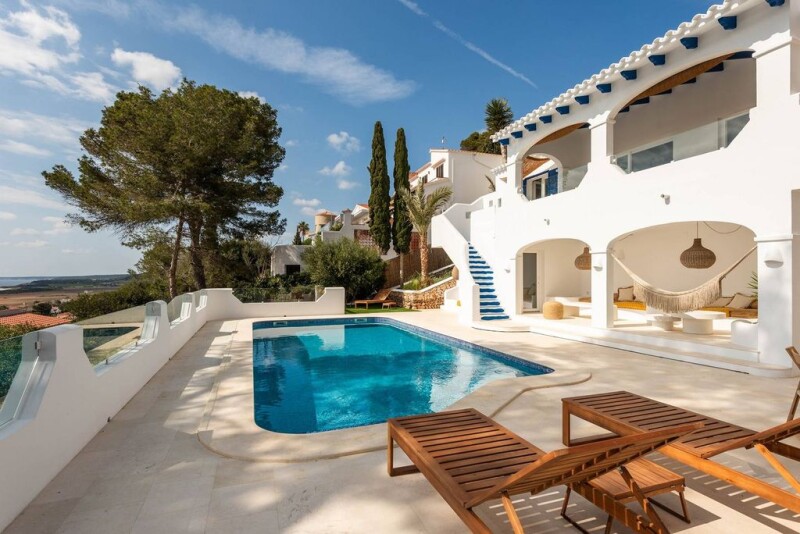 Discover this elegant renovated villa with exquisite taste in the high area of Son Bou, one of the most appreciated beaches in the south of Menorca. With an architectural design that combines organic lines, Mediterranean elements, and natural details, this property offers bright, comfortable spaces perfectly integrated into the environment. Distributed on several levels, the villa has spacious terraces facing the sea, a private pool, chill-out areas, an outdoor bar, and shaded spaces to enjoy the Menorcan lifestyle. Inside, high-quality finishes, a designer kitchen, and a cozy atmosphere create a unique atmosphere, ideal for both living and investment. With a valid tourist license, this property represents an excellent opportunity for those looking for a charming villa, ready to move in, in a quiet location just a few minutes from the beach.