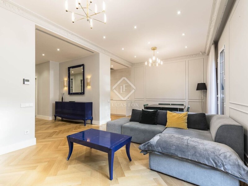 This magnificent apartment , renovated to the highest standards, is located in a refurbished period building with a beautiful lobby with a lift. It is in an unbeatable and very central location, in the coveted Eixample Right of Barcelona, very close to the Diagonal and Passeig de Sant Joan. This is a property ready to move into. It is furnished and brand new thanks to an excellent renovation that has been carried out with top quality finishes and a modern design. It also retains attractive features of a modernist building , such as high ceilings and large windows, which give it a special character and provide abundant natural light and a feeling of spaciousness. The apartment consists of a spacious and bright dining room living room with access to two balconies overlooking the street. Next is the open kitchen, which is equipped with panelled appliances . In the night area we find the three bedrooms of the property: two double bedrooms that share a bathroom and the main bedroom with a dressing room, private bathroom and access to a small terrace overlooking the quiet courtyard of the block. The property is equipped to ensure your maximum comfort, with radiator heating, hot-cold air conditioning by splits and wooden floors. In addition, it is very close to several public transport options and in a location that will allow you to fully enjoy everything the city has to offer.