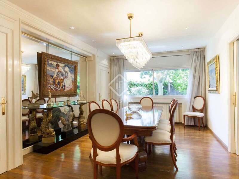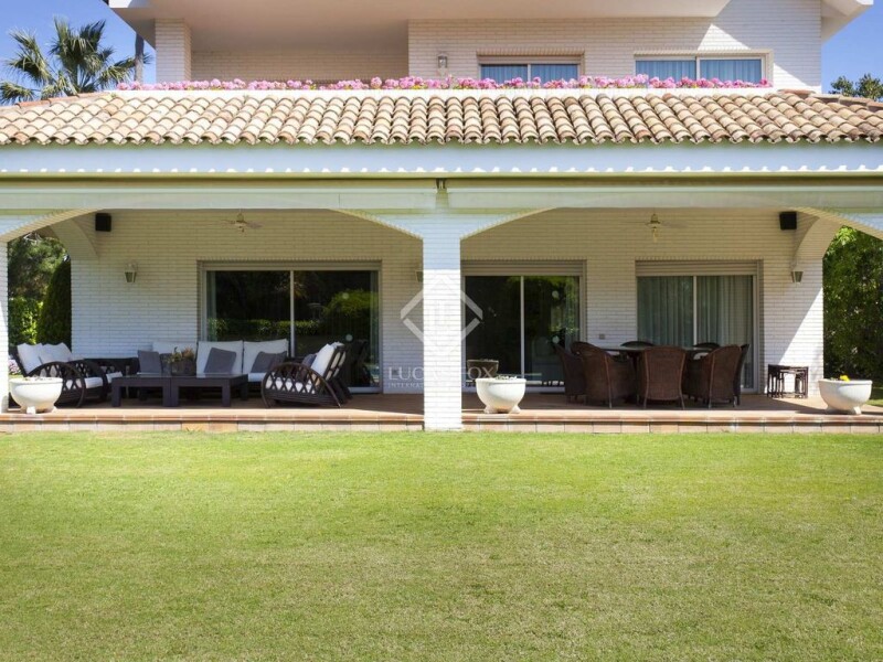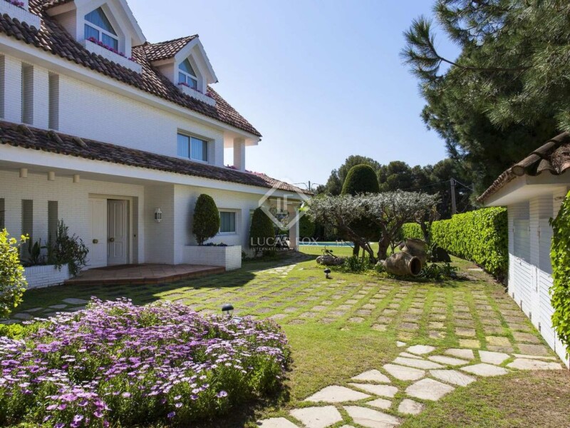 Stunning traditional family villa with a beautiful flat garden, plenty of lawn, a large pool and a covered terrace, located a couple of minutes' walk from the beach. We enter the villa via a grand hallway with a sweeping staircase to the left. Ahead and to the right are 2 elegant living rooms with direct access to the covered terrace, garden and swimming pool. The second lounge leads to a large, elegant dining room which can also be accessed via the hallway. From there you enter a large, functional kitchen with a seating area, a laundry room and pantry with access to the garden. The ground floor also houses a guest toilet and an en-suite bedroom. Upstairs to the left are 2 suites, one with a walk-in wardrobe and one with fitted cupboards, a further suite to the right with a walk-in wardrobe, and the master suite with its vast sitting/dressing room leading via double doors to the bedroom which in turn leads to a very large complete bathroom. A sizable terrace overlooking the pool is accessed via the bedroom and living area of the suite. There is a very large attic space which houses a library/living area with a fireplace. It is divided into 2 rooms. There are high quality wooden floors and a terrace at one end with a glimpse of the sea. In the basement there is a triple garage as well as an entertainment room with a bodega, dining area and pool table. A separate entrance in the main building leads to the service quarters which comprise a living area/kitchen, bathroom and 3 bedrooms. There is a separate building housing a sauna, mini gym and bathroom. The property is currently semi-furnished, offering the new owner the opportunity to customize it to their liking. Don´t miss the opportunity to get this prestigious Sitges villa in a high - end area with a very large plot of land.