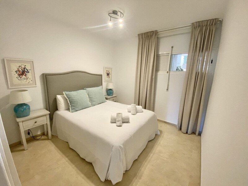 Fantastic apartment with sea views in the prestigious Las Terrazas de las Lomas de Marbella Club urbanization. Located in a secure and gated community within the Golden Mile of Marbella, it has well-kept mature gardens, a large pool with views of the sea and mountains and a particular architecture of the complex with a beautiful park, spa area with sauna and gym, as well as 24-hour security service with surveillance cameras. The complex was designed by the renowned architect Fernando Higueras and is recognized as Andalusian Heritage. This spacious 2-bedroom apartment with panoramic sea views and a huge south-facing terrace is situated on the middle floor of a prestigious complex and comprises comfortable accommodation comprising an entrance hall, a generous living/dining room with fireplace and access to the sunny semi-covered terrace. A fully equipped kitchen with high quality appliances. The master bedroom has large built-in wardrobes and an en-suite bathroom. Also a large double bedroom and a full bathroom. Marble floors throughout the house, electric blinds, electric awnings, air conditioning and double-glazed wooden windows. It is a great investment since it is one of the few apartments in the complex that has a valid Tourist License. The Golden Mile is one of the top locations of Marbella where you can find restaurants, Corte Inglés and the best beach clubs. Just 5 minutes from Puerto Banus, and Puente Romano area, the beach, schools and sports facilities are close to the apartment. It includes a large garage and storage room for a more comfortable life.