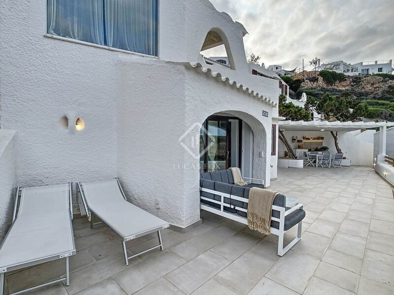 Lucas Fox presents this wonderful contemporary-style apartment of 75 m² with a 95 m² terrace, parking and tourist license on the seafront, just a few meters from the descent to the beach and replans of Cala Morell, Ciutadella de Menorca. The property is distributed on one floor and is located on the first floor of the complex, with access via a ramp. We cross the entrance and the corridor leads us to the wonderful terrace with different environments, barbecue area with dining room , exterior storage room and chill-out area with spectacular views of Cala Morell. From here, we access the spacious living-dining room with folding windows that allow the entry of plenty of natural light and spectacular views of the sea. The living room connects us with a small, but complete, fully equipped kitchen and whose corridor leads us to a bathroom with a trapdoor in the ceiling with a wooden staircase to access the small storage room. From the living room, we enter a small hall that leads us to two double bedrooms with beds on two levels that share a bathroom. The apartment has an alarm, hot-cold air conditioning splits, ceiling fans in the bedrooms, aluminum exterior carpentry with double glazing imitating wood on the exterior and white on the inside that harmonizes with the furniture and built-in wardrobes. The property belongs to a complex of 11 apartments. This one has a parking space and a tourist license. It was completely renovated in 2022 with exceptional quality, but the beauty of the rock was preserved as a decorative element in the kitchen and in one of the bathrooms. Without a doubt, this is an ideal property to live in all year round, spend time with family or friends or to rent out as a holiday home as it has a tourist license. Please contact us for more information or to arrange a visit.