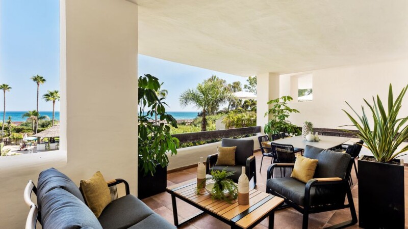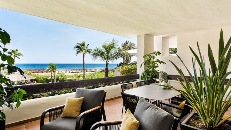 Fully renovated top quality 3-bedroom first floor apartment. Frontline beach, south – West facing, sea views, quiet and private. Direct access to the beach. Spacious living and dining area with fully fitted open plan kitchen (Neff appliances). Master bedroom en suite and two guest bedrooms sharing a bathroom. Underground parking and storage. Direct access from the living areas to a large terrace and the communal nature and lush gardens and community pool. Great location, Less then 5 minutes drive to all amenities. Furniture included in the price.