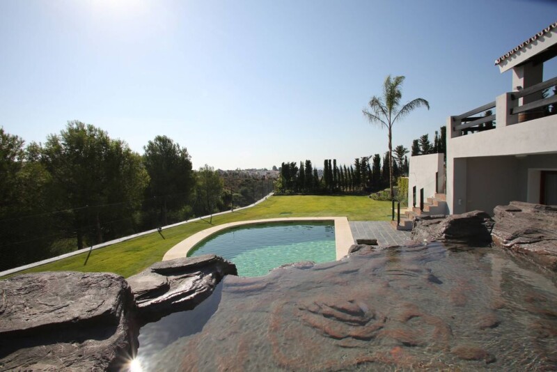 Contemporary family villa in La Resina Golf, Estepona A stunning and modern villa for sale in La Resina Golf, Estepona. Located in a quiet and private area close to the clubhouse of the popular La Resina Golf & Country Club in Estepona. Ideally set in a gorgeous residential area within only 10-15 min drive to Puerto Banus, 5 min to Laguna Village, 8 Min to Estepona Town The beautiful property offers the best in terms of comfort. With beautiful views over the golf course and also the Mediterranean, this is the perfect home for a family looking to settle down in Costa del Sol. There are 4 bedrooms with en-suite bathrooms. Worth mentioning is the full alarm system, the fully fitted kitchen with great appliances, and the double-height ceilings. Outside you will find the beautiful rock pool with a waterfall that falls into the pool.