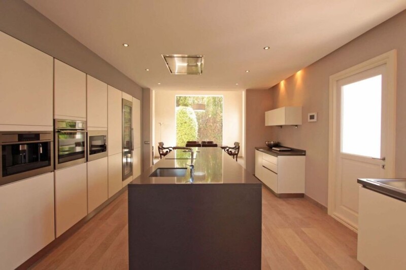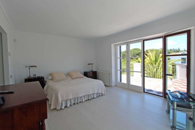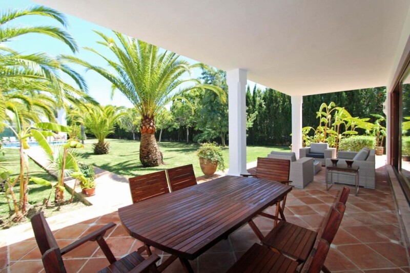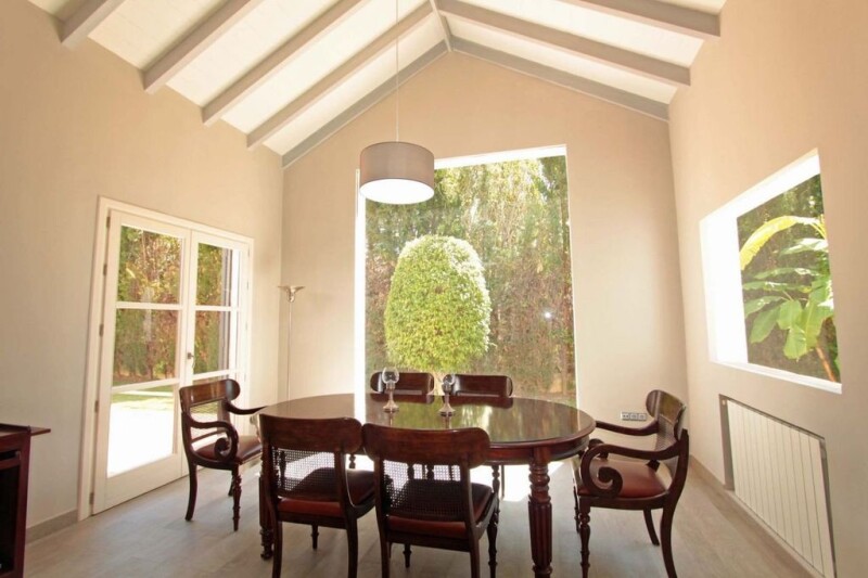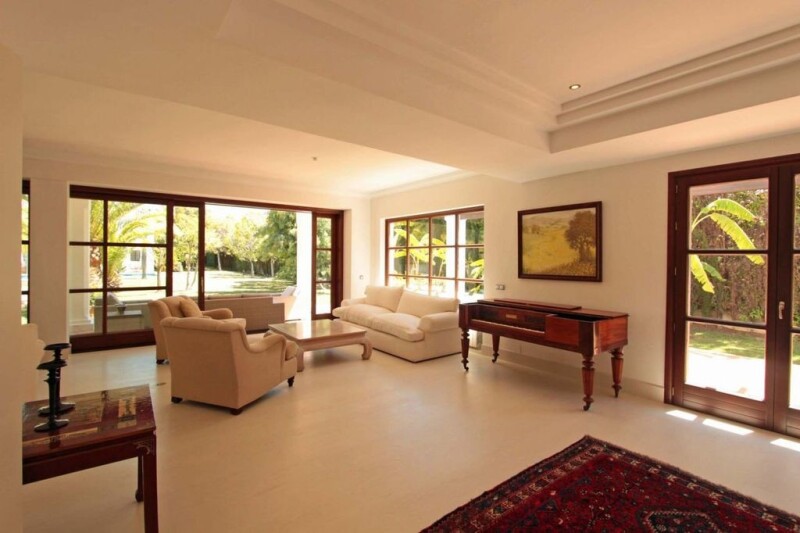 Mediterranean style villa in Gadalmina Baja, Marbella close to the beach An elegant villa in Marbella near the beach with a total of five bedroom suites built over two levels plus one bedroom for staff. Designed by Cesar Leyva with Mediterranean style, in accordance with the style of Guadalmina Baja, but completely renovated in 2014 to modernize the interior with quality construction materials to the times. Set in extensive grounds of 3,400 m2 with a beautiful swimming pool incorporating a fountain, masses of mature palm trees and protected by a high wall and green foliage. Puerto Banus is at a 5 min. drive and Marbella 10 min. The beach and Guadalmina, commercial centre is at a short walk. The high square entrance hall with a vaulted wooden ceiling is a trademark of the architect as well a charming covered patio in Andalusian style that leads to the entrance hall. The large living room has two sitting areas and access to a covered terrace with views to the garden and swimming pool. The main dining room is separated. The new and modern kitchen has two large fridges and deep freezers, wine refrigerator, coffee machine, and an office. On the ground floor there are two bedrooms with en suite bathrooms. On the first floor is the master bedroom with en suite bathroom, with bathtub and separate shower, and access to a terrace with views over the garden. Another bedroom en suite bathroom on this floor. At the end of the garden by the swimming pool there is a bungalow with a bathroom to assist the swimming pool, a veranda closed by glass curtains and fireplace so to be used in winter, and a bedroom with en suite bathroom on the first floor. A floodlight paddle court and a garage complete this magnificent property. The house was finished with the best construction materials, white wooden floors except in two bedrooms on the ground floor which are in marble. The bathrooms have under floor heating. There is air conditioning and central heating. A floodlight paddle court and a garage complete this magnificent property.