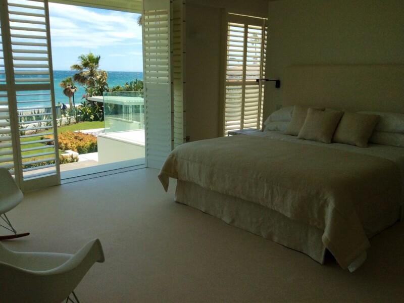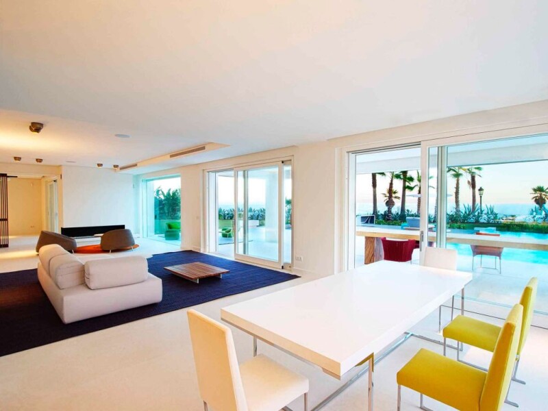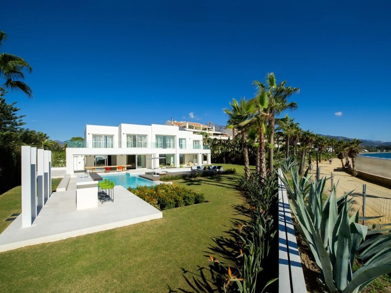 Rio Verde Playa is one of the most impressive frontline beach projects in Marbella, the only modern contemporary design on the Golden Mile on walking distance to both Puerto Banús and Marbella. The modern villa, which is completed since summer 2013, combines the very best of modern architecture with the ultimate in interior, installations and technology. The approx. 1.000m2 constructed area are distributed amongst 3 levels with 7 bedrooms and 7 bathrooms. The basement consists of a laundry room, machine room, a bar, cinema room, sauna, gym and a guest bedroom en-suite (self-containing with seperate entrance) which can be used for staff. The garden area contains a massive 80m2 heated pool surrounded by decking.