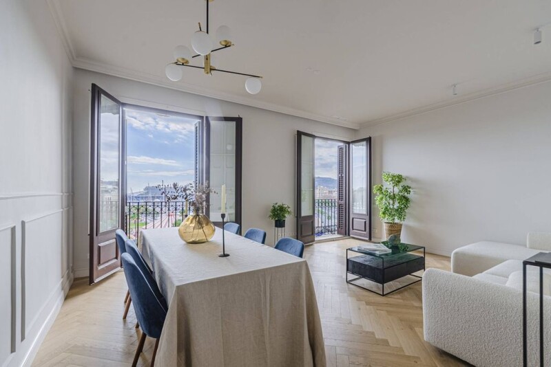 Wonderful property on the fourth floor completely renovated of 87 m2 with 2 bedrooms and 2 bathrooms with the best views in the Port Vell. Upon entering the property there is a hall that leads to the first single room overlooking the courtyard of the building, next to the room is the first bathroom with shower equipped with beautiful taps. Then continuing along the corridor you reach the large open kitchen equipped with high-end appliances and a large central island. The kitchen is next to the elegant living - dining room illuminated with beautiful natural light coming from the balconies overlooking the harbor (Port Vell). Next to the living room is the spectacular and spacious master bedroom with comfortable dressing room and fabulous ensuite bathroom. The property was completely refurbished in 2024 with oak floors, air conditioning and heating ducts, double glazed doors and windows, and is located in a building with elevator and communal roof terrace with the best views of the Port Vell.