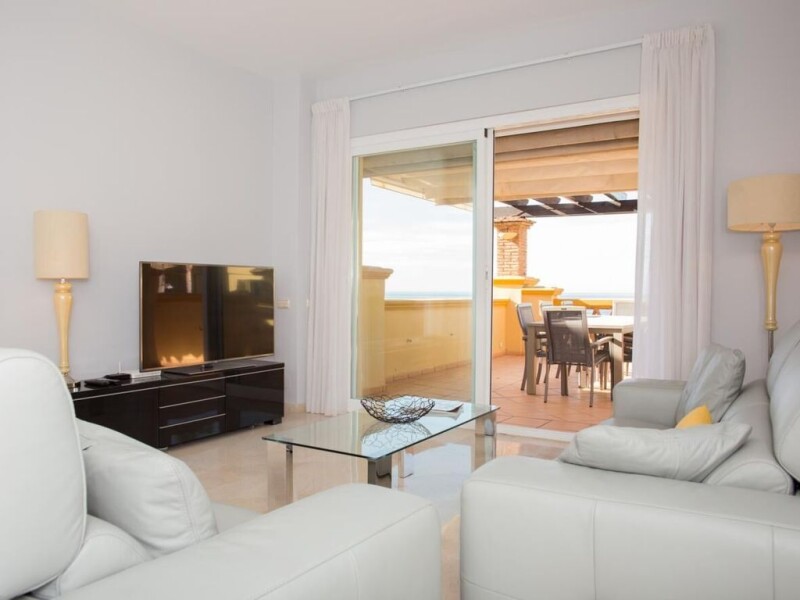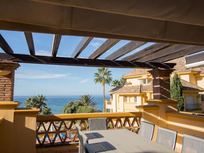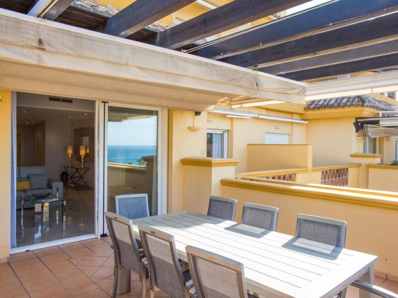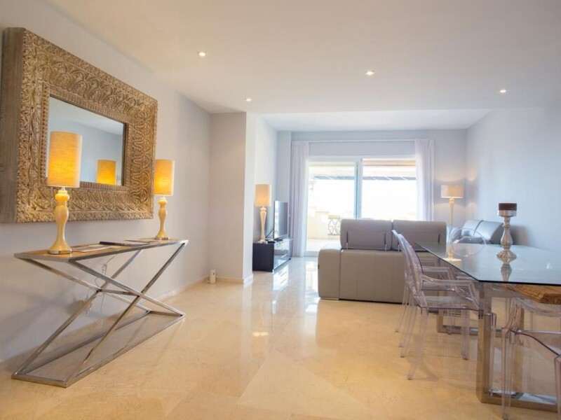 Exclusive two bedroom apartment located in front of the sea in the distinguished and gated complex of Río Real Playa, right next to Marbella in the east, and only a few minutes from Puerto Banús. This cozy and well-kept apartment offers all the comforts of a holiday home, including a bright living / dining room, a well-equipped kitchen and two double bedrooms with en-suite bathrooms, one with a bathtub and the other with a shower. The master bedroom and living room, both facing south, have direct access to individual terraces with picturesque views of the Mediterranean Sea and overlooking one of the community pools. The apartment is decorated in a modern and tasteful style and includes IPTV with international TV channels, Wi-Fi or fiber optic LAN Internet connection, alarm system, video entry system, hot and cold central air conditioning, marble floors, double glazing and shutters, as well as two garage spaces and an elevator. The urbanization has exclusive manicured community gardens, two community pools, one of them heated, and areas for sunbathing with hammocks and two children's pools. Both pool areas also offer access to the beach, one that leads through to the well known beach restaurant called "Trocadero Playa". Location description Río Real Playa is an elegant and sought-after residential area located directly on the beach next to the town of Marbella, just a few minutes by car from the center of Marbella and a 40-minute drive from the international airport of Malaga. Quick access to the national road N-340 heading west and east are very close. The community offers exclusive high quality and well maintained apartments and penthouses in a unique position. The 18-hole Rio Real Golf with its clubhouse is just a few minutes away, as well as a small luxury boutique hotel, offering a wellness center. Properties in Río Real Playa are very popular due to the unbeatable beachfront location, the high level of urbanization and the proximity to the city center.