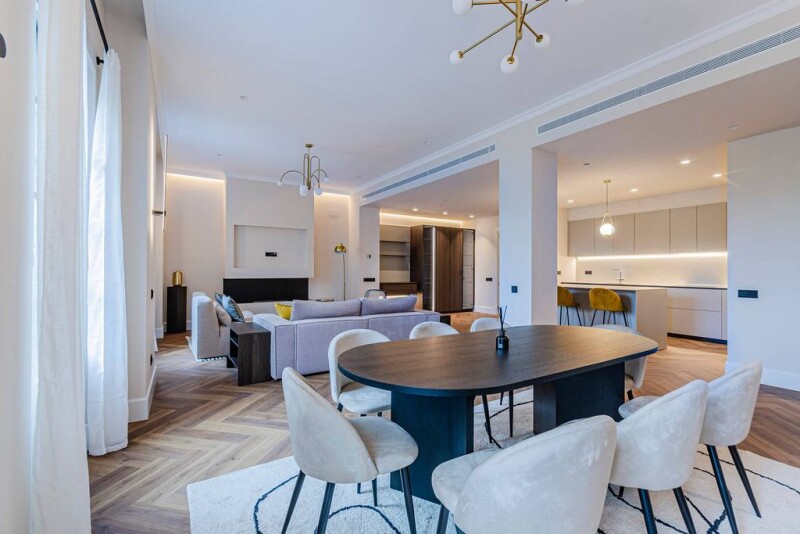 Located between the emblematic streets of Paseo de Gracia and Urquinaona, this meticulously renovated apartment offers an exceptional living experience with a bright, open layout and premium finishes. The property is fully exterior, allowing natural light to pour into every room, creating a warm and inviting atmosphere. As you step inside, you’ll find a well-organized entrance area that includes a separate laundry room and a practical storage space, along with a guest bathroom for added convenience. The main living area opens up into a large, open-plan space perfect for modern living. At over 65m², this sun-drenched area comprises a spacious living and dining room, seamlessly connected to a state-of-the-art kitchen. The three exterior balconies not only enhance the apartment’s brightness but also offer beautiful urban views. The kitchen is equipped with high-quality Siemens appliances, including an integrated wine cooler, American-style fridge and freezer, and a fully equipped kitchen island that serves as the heart of the space, perfect for both cooking and socializing. The living area is accentuated by a modern water fireplace, adding a unique decorative feature. The night area is designed for comfort and privacy, featuring three well-proportioned double bedrooms. The master suite offers the ultimate luxury with its own en-suite bathroom, which includes a designer bathtub, separate shower, and dual sinks. The second full bathroom serves the remaining bedrooms, and there is an option to add a fourth bedroom if desired. This apartment has undergone a complete renovation, incorporating top-tier materials and modern comforts. Independent air conditioning and heating systems are installed throughout, along with water purification and softening systems. The property is move-in ready and is being sold fully furnished with tastefully selected pieces. One of the most desirable features of this property is the inclusion of two generously-sized parking spaces within the building, a rare find in this area. Additionally, the building is equipped with a concierge service, ensuring security and convenience for residents. This is a prime opportunity to live in a fully exterior-facing apartment that combines luxury, functionality, and an unbeatable central location between two of Barcelona’s most emblematic streets.