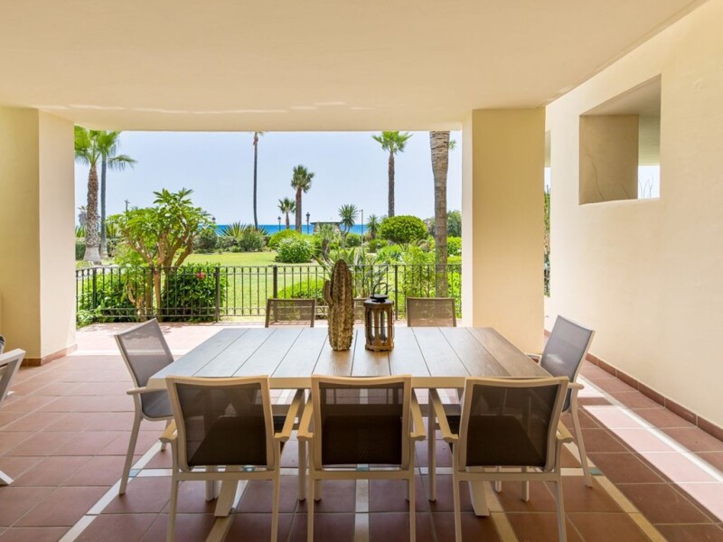 This superb ground floor apartment on the outskirts of Estepona has been refurbished to the highest of standards to over the very best in quality beachfront living. Every last detail has been meticulously taken care of, utilizing materials of the highest standard in the lighting, furnishings and interior design, making this property "suitcase ready" to move in to. In an outstanding front line beach position, this apartment not only enjoys excellent sea views and the mesmerizing sound of waves crashing on the Mediterranean shoreline just meters away, but it also has a fabulous feature of a gated terrace area which opens out directly onto the community gardens. The covered terrace, with terracotta tiles enjoys the beauty of green space and the fresh Mediterranean breeze. With generous proportions, this three bedroom apartment has been totally refurbished in a cool, contemporary design, offering a spacious and comfortable living area, featuring sumptuous furniture and beautiful modern art. The adjoining state-of-the art kitchen has the latest silestone worktops and NEFF appliances. The flooring throughout the living area is elegant, oversized matt-finish porcelain tiles adding a clean, modern look. This beautifully-appointed apartment has 3 sumptuously furnished bedrooms and 3 bathrooms with high quality bathroom suites, tiling, mirrors, lighting and flooring – all accessed along a light, airy and spacious corridor. With a south-facing orientation, the apartment has the advantage of a large communal swimming pool, with bridge feature and solarium area, with a bar in summertime. The apartment is sold complete with underground parking space, and storage room. With direct access to the beach, and just a few minutes by car to the center of Estepona, this bright, spacious and elegant apartment is undoubtedly one of the most sought-after properties within this development.