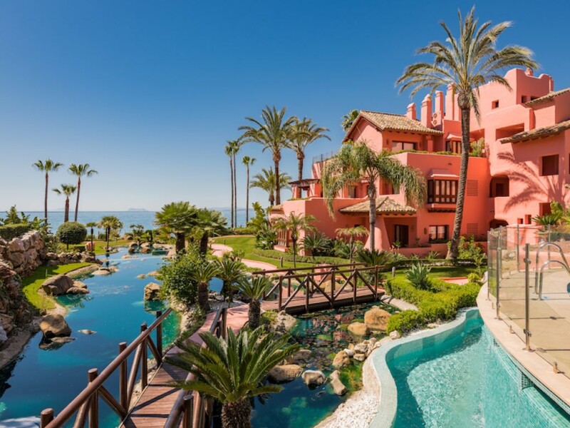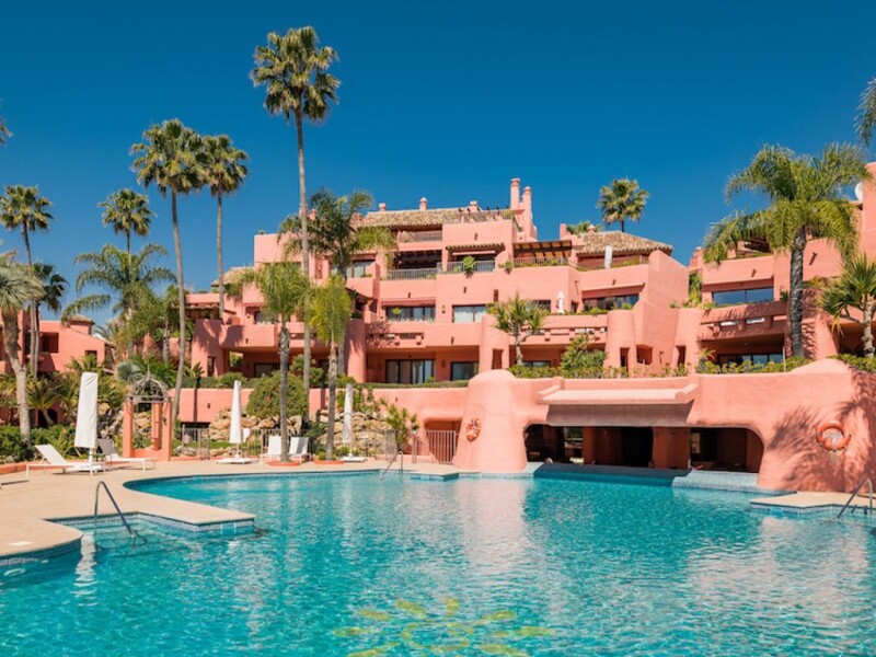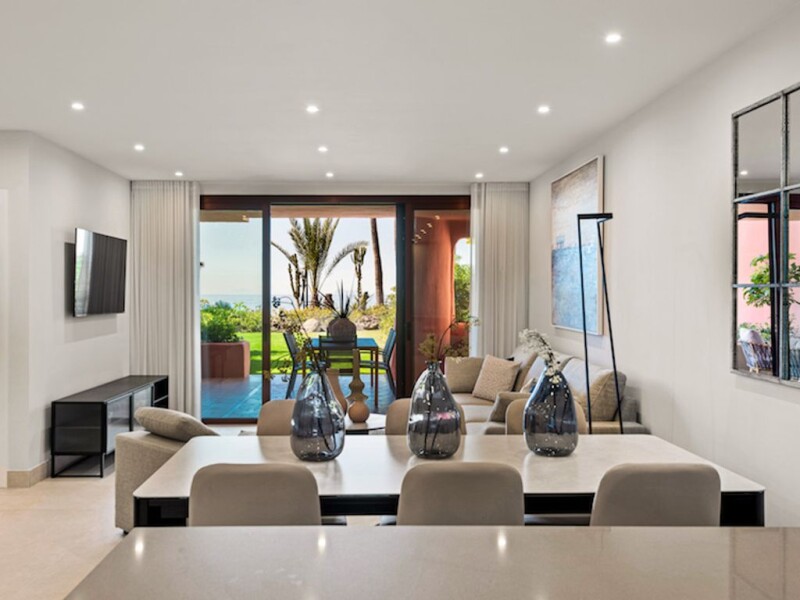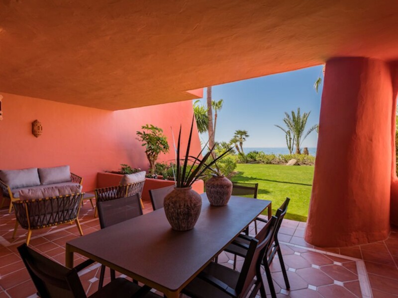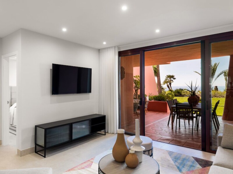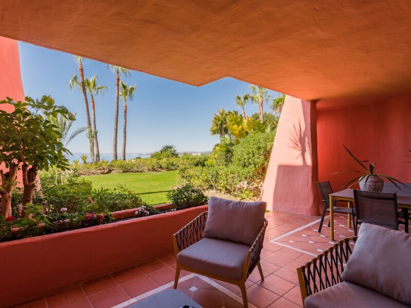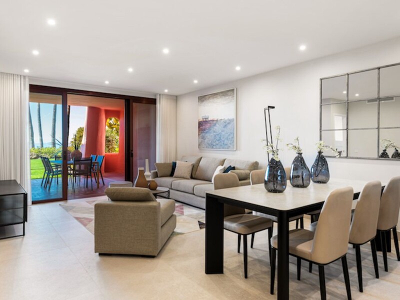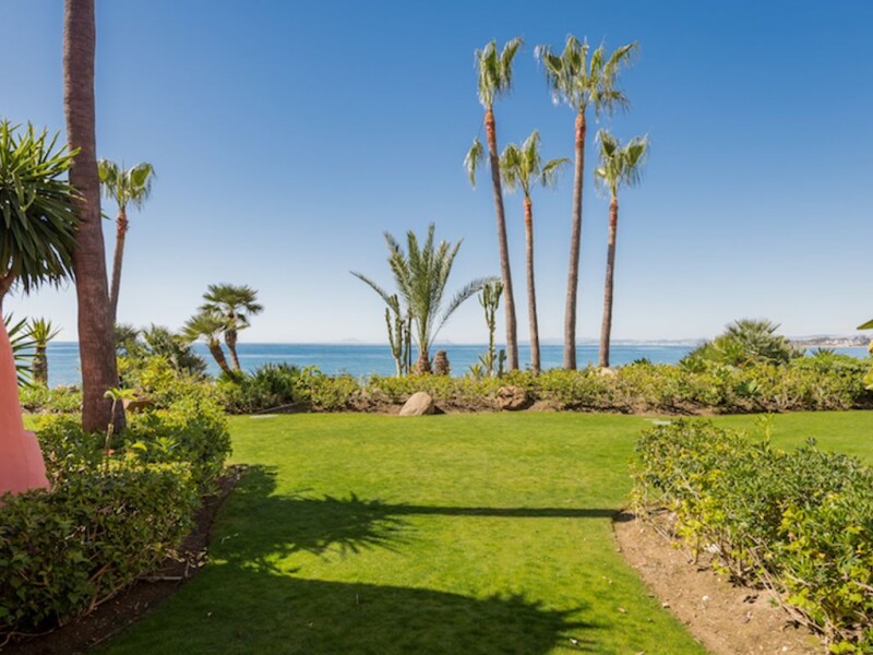 Front line beach, fully renovated ground floor garden apartment in a luxury residential complex on the New Golden Mile in Estepona. Done to the highest specifications and fully furnished. Sea and garden views, South facing. Living/dining area, fully fitted open plan kitchen, master bedroom suite and two guest bedrooms sharing a bathroom. Direct access to the covered and open terraces and gardens. Two communal pools, an indoor pool and gym. Gated and 24hrs security.