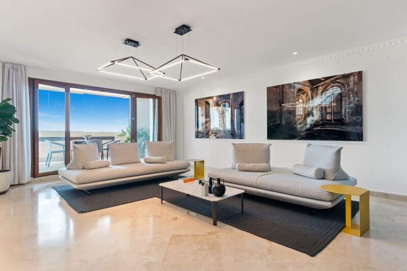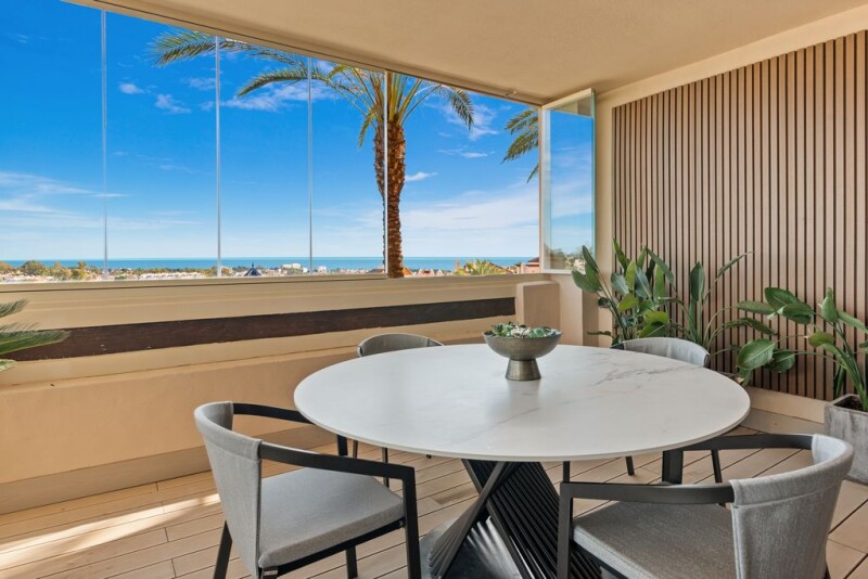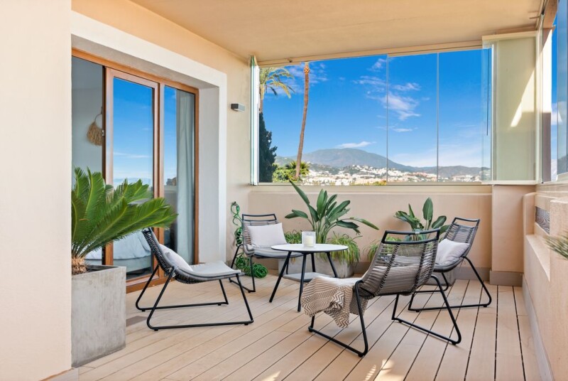 Top quality, fully renovated first floor 3-bedroom apartment in El Paraiso Alto. South to S-E facing with spectacular panoramic views to the Mediterranean and the mountains. Totally private and close to all amenities. Entrance hallway, living and dining area, fully fitted kitchen with Whirlpool appliances, separate laundry area. Master bedroom en suite and two guest bedrooms sharing a bathroom. Large terrace with access from the living area with glass curtains. Another private terrace from one of the guest bedrooms. Two parking spaces and one storage room. Gated community with a salt water pool and mature gardens.